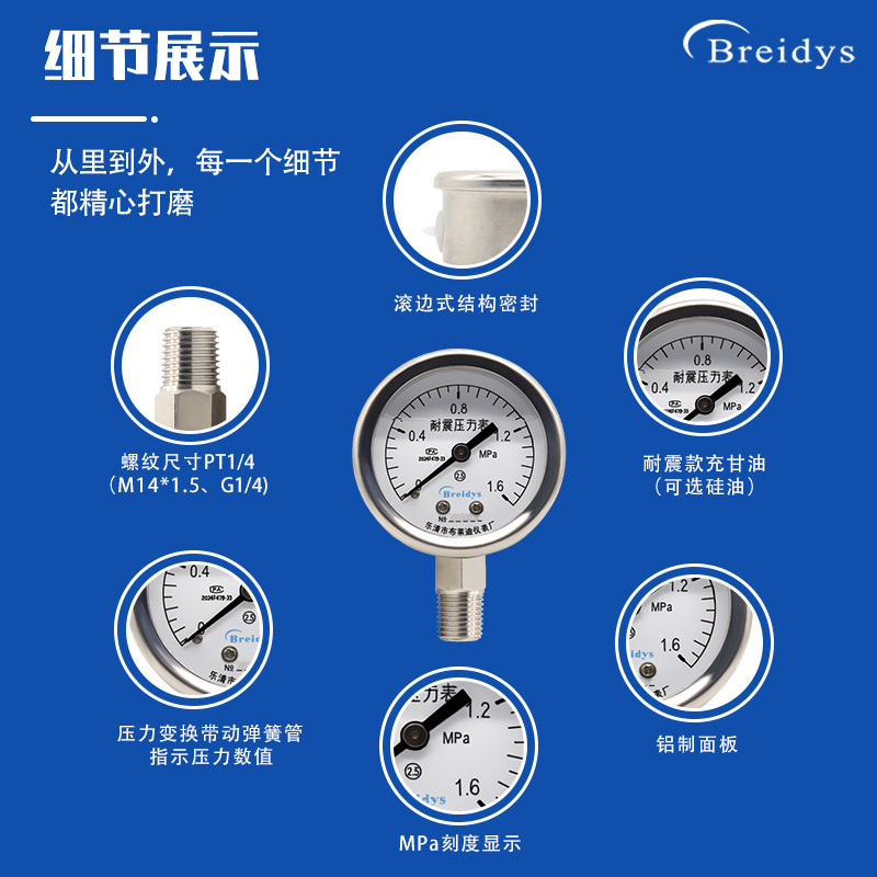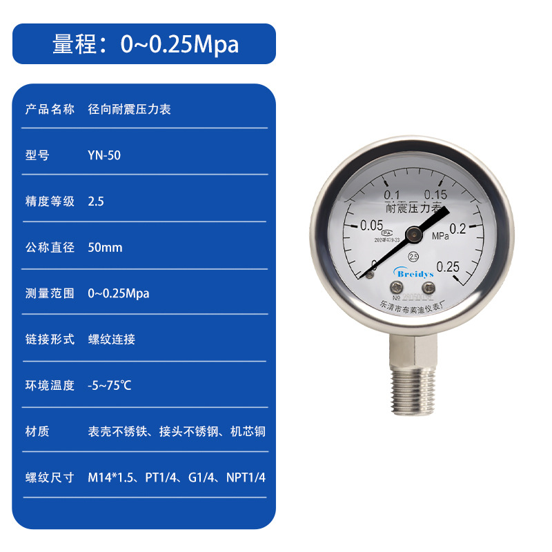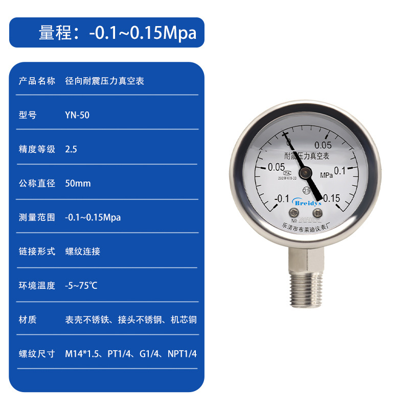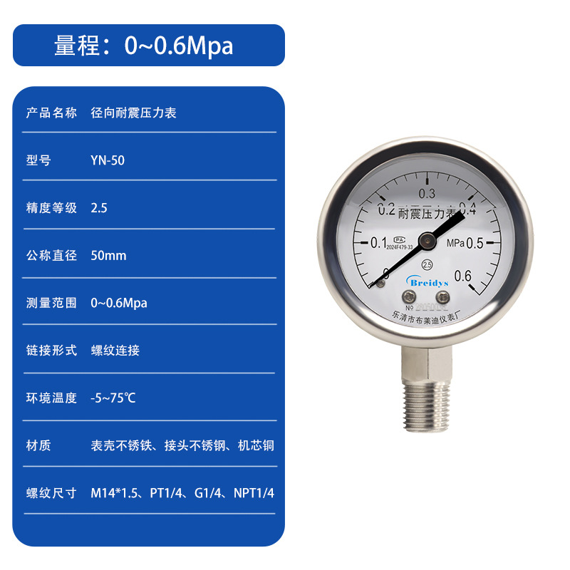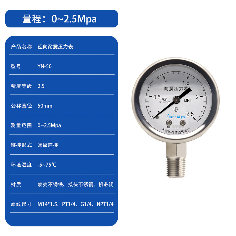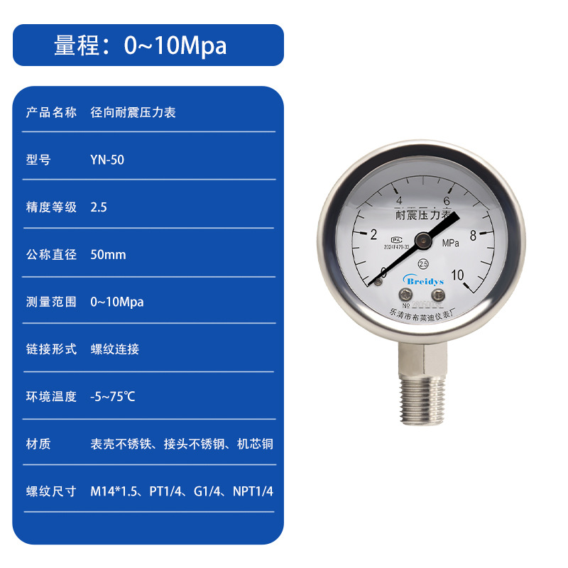 Манометр YN50 ударопрочный манометр Высокая точность Гидравлический барометрический вакуумный метр 0-1.6/2.5/40mpa