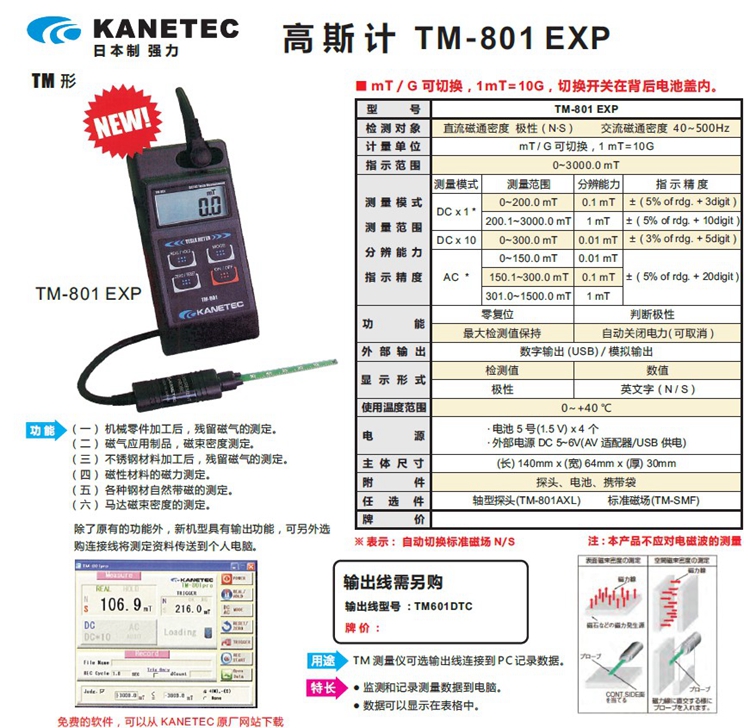 2.特斯拉计是结合KANETEC公司多年的磁性产品的经验和成果研制出的,一种实用的、手拿式的数显高斯计。