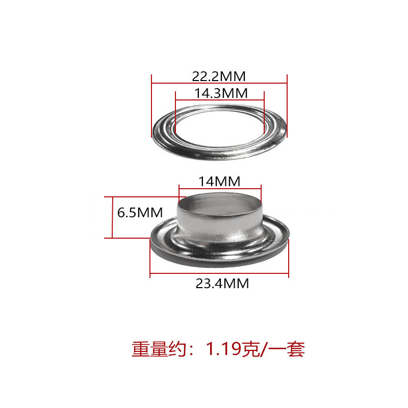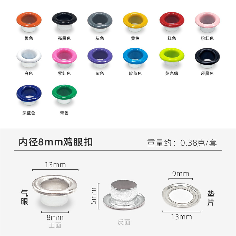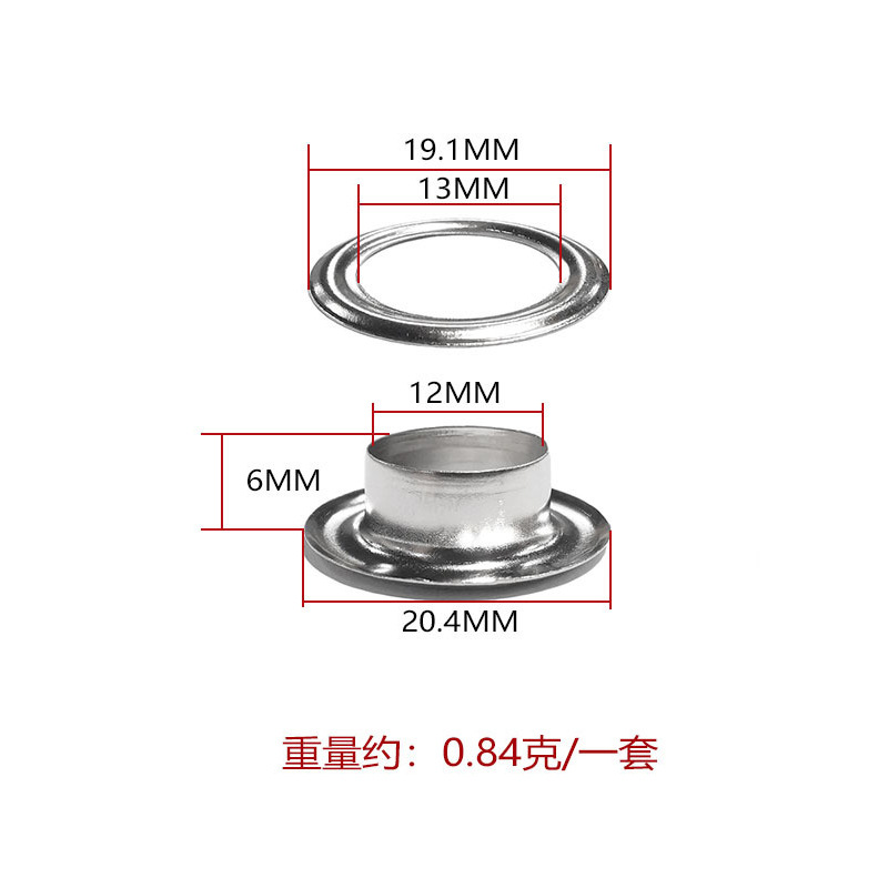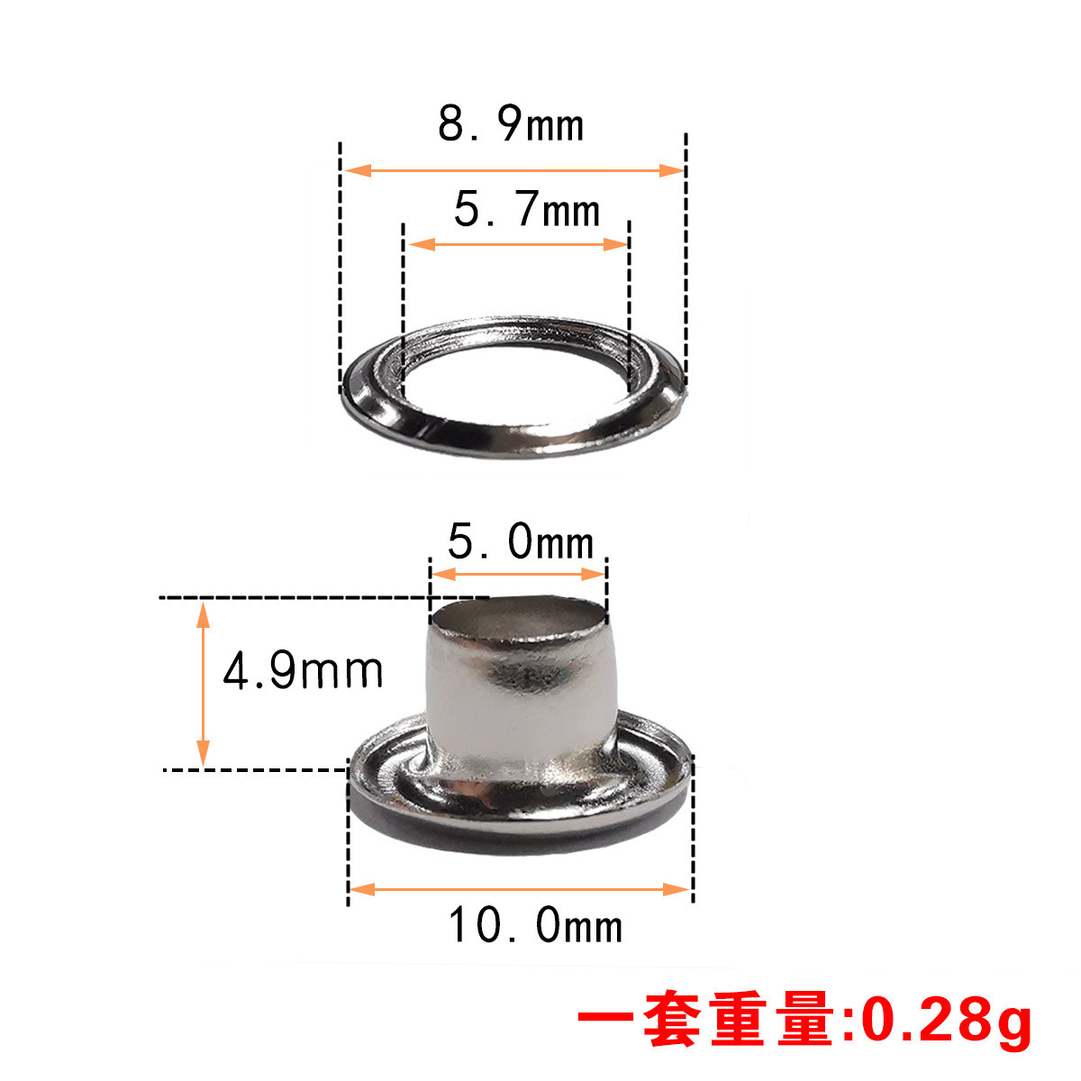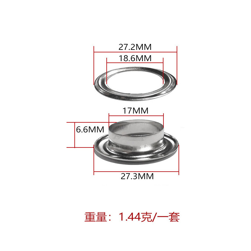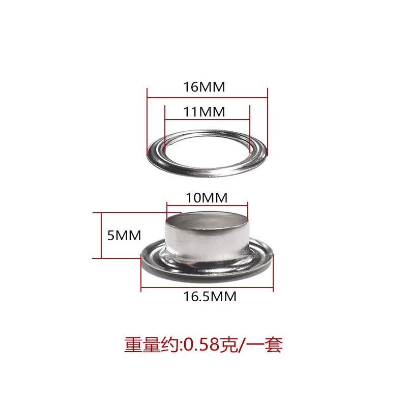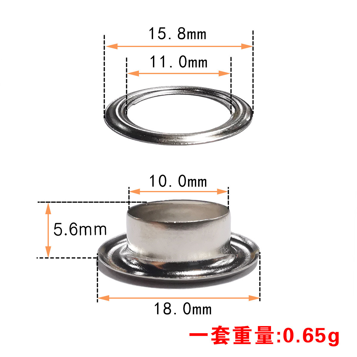 | 国标号 | 内径d1 | 外径dk | 总高度 | 鸡眼重量 | 垫片重量 | 一套重量 | 彩色鸡眼 | 圆边铁鸡眼 | 圆边铜鸡眼 | 压边鸡眼铜 |