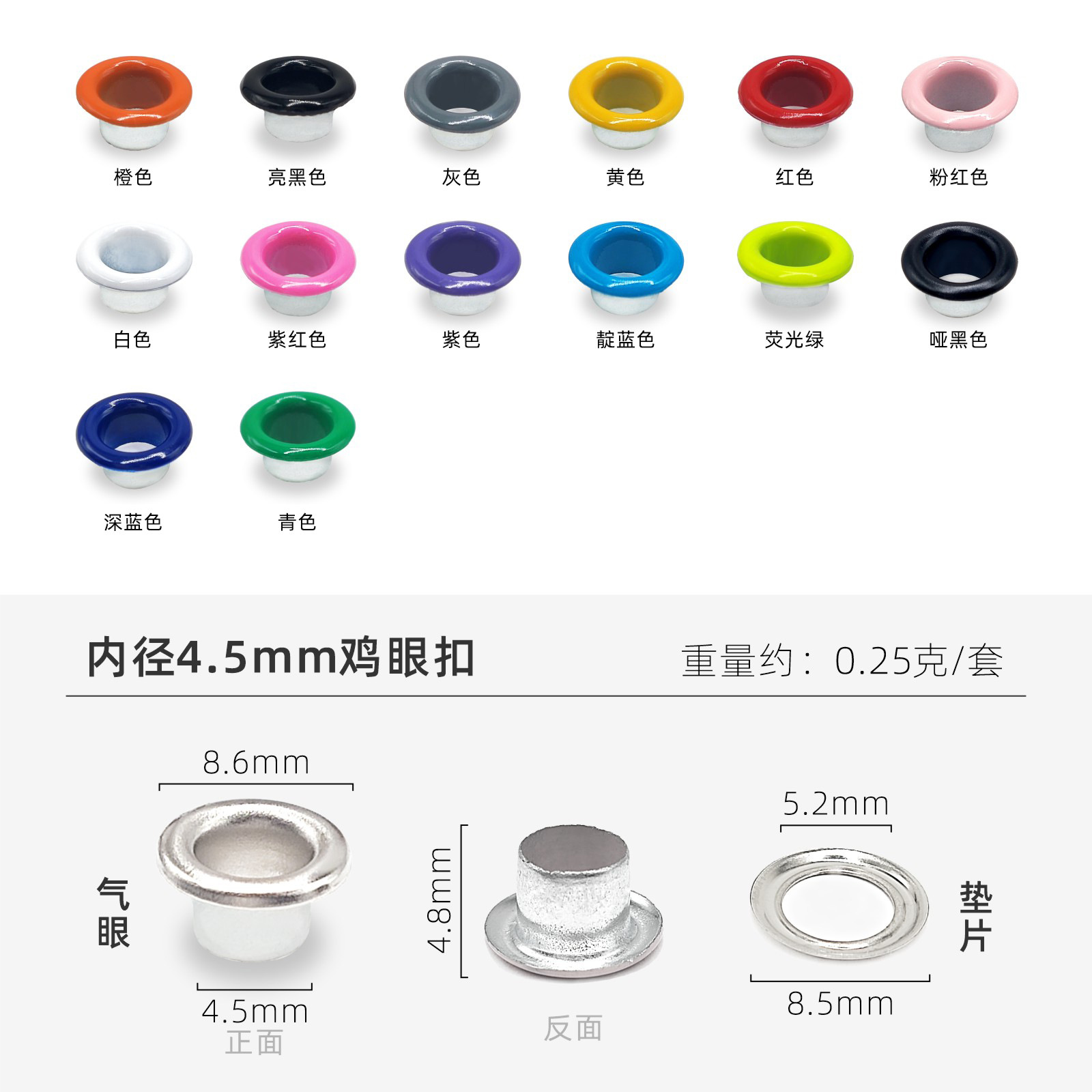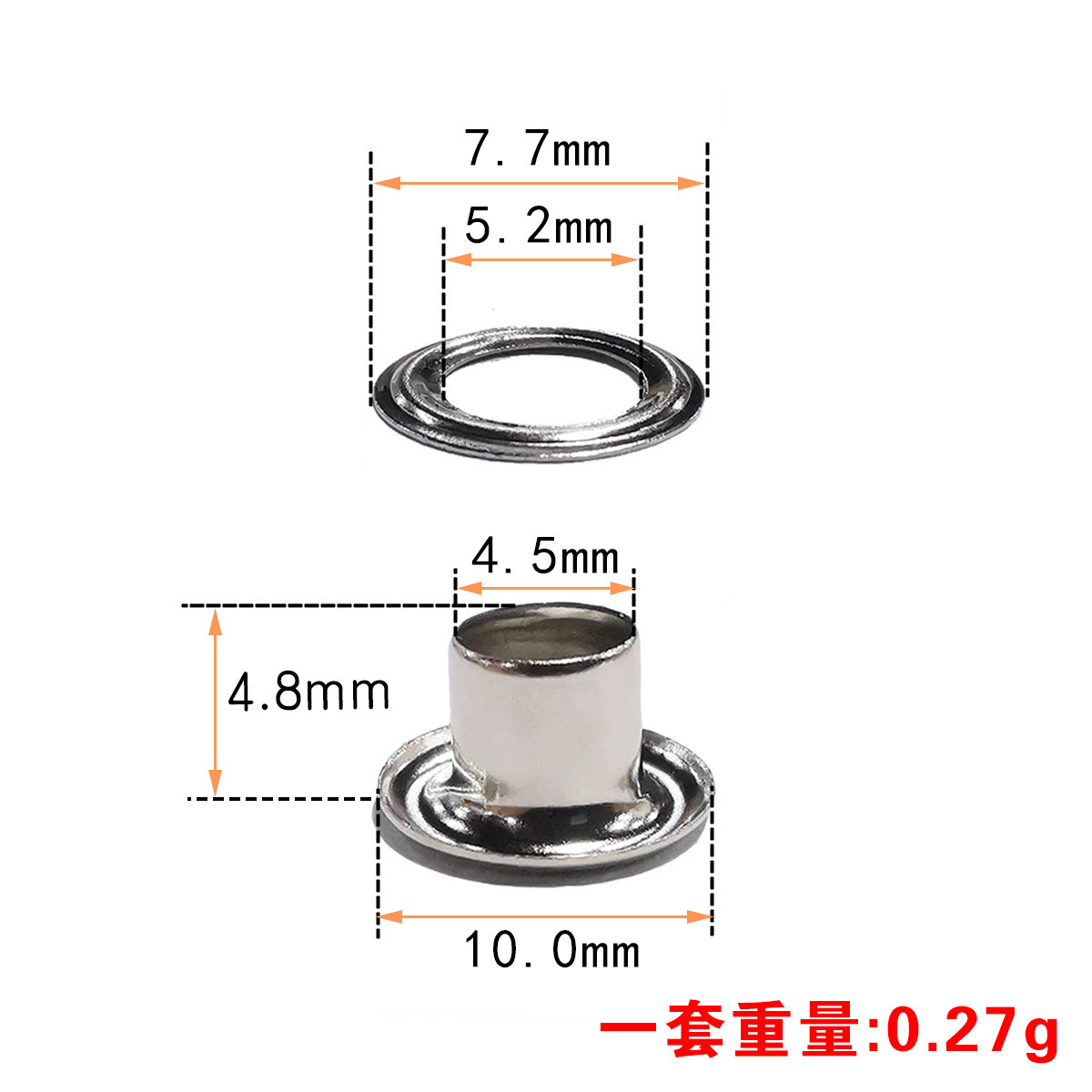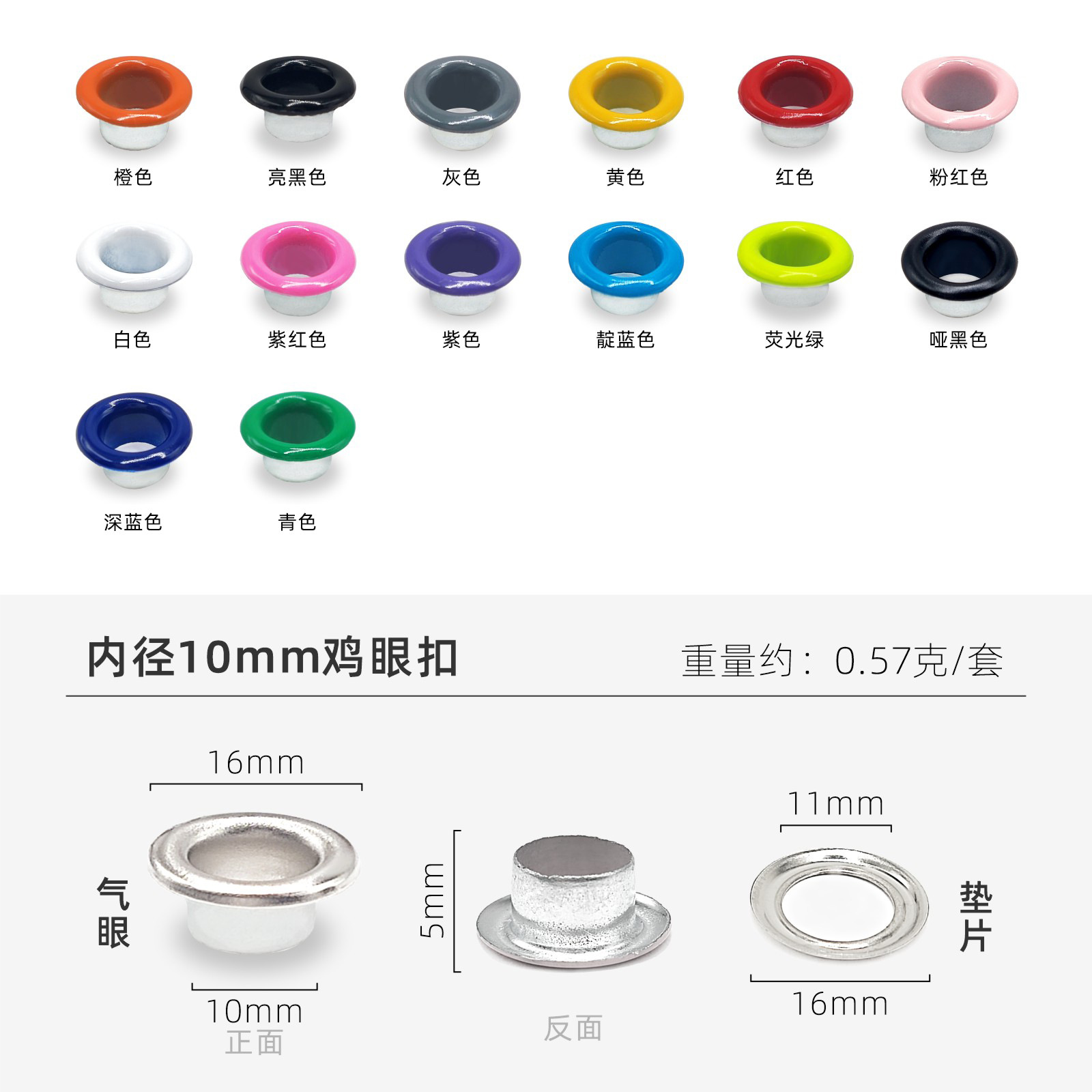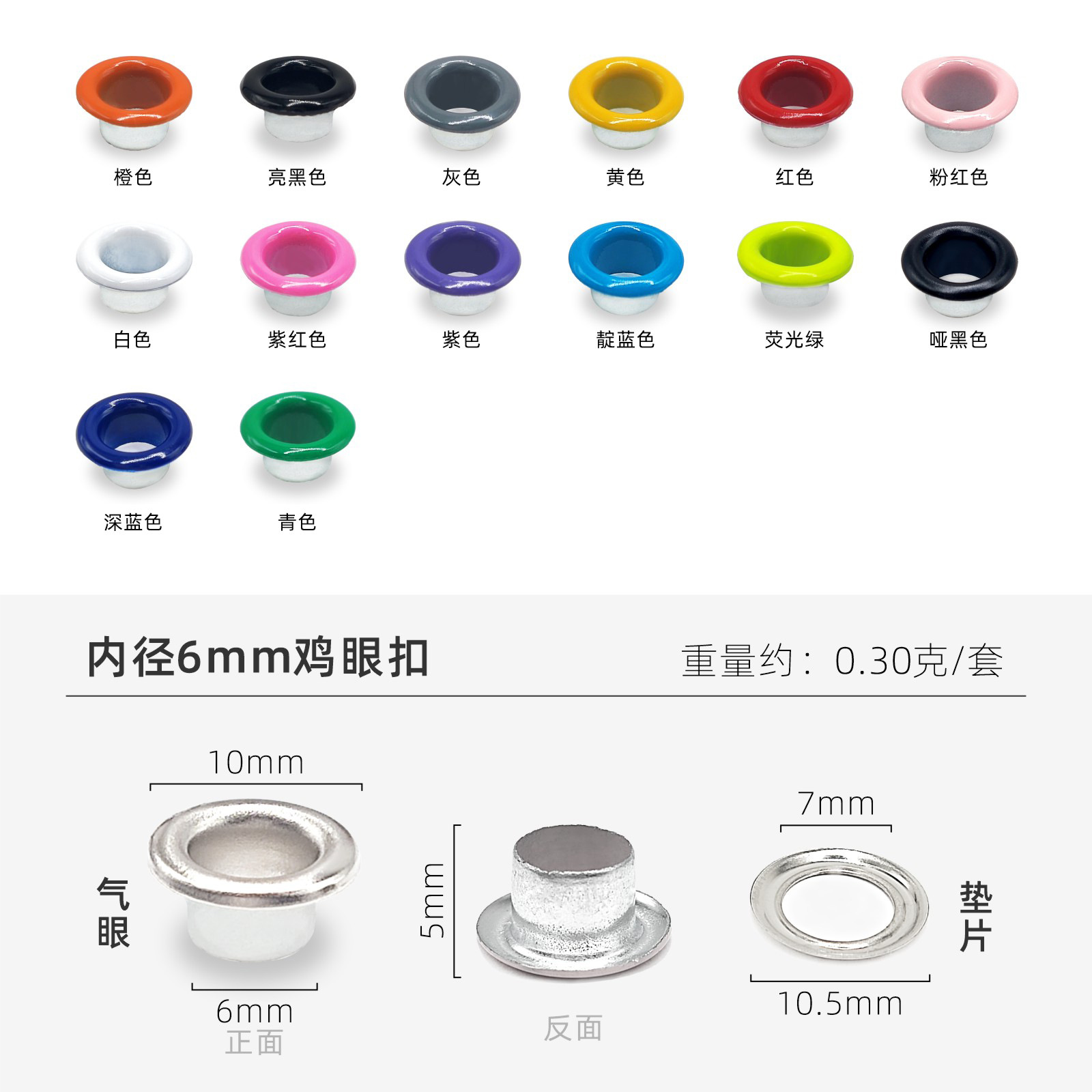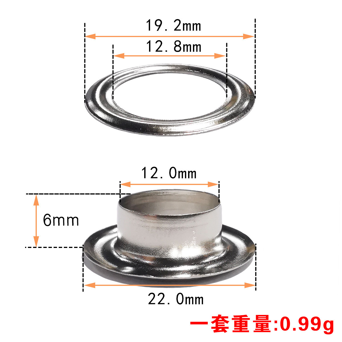 | 国标号 | 内径d1 | 外径dk | 总高度 | 鸡眼重量 | 垫片重量 | 一套重量 | 彩色鸡眼 | 圆边铁鸡眼 | 圆边铜鸡眼 | 压边鸡眼铜 |