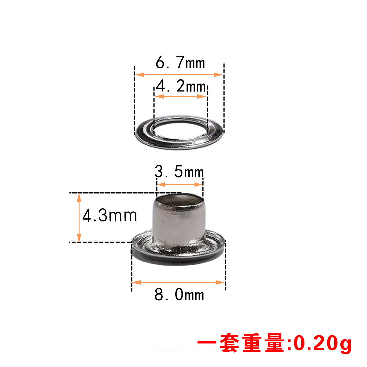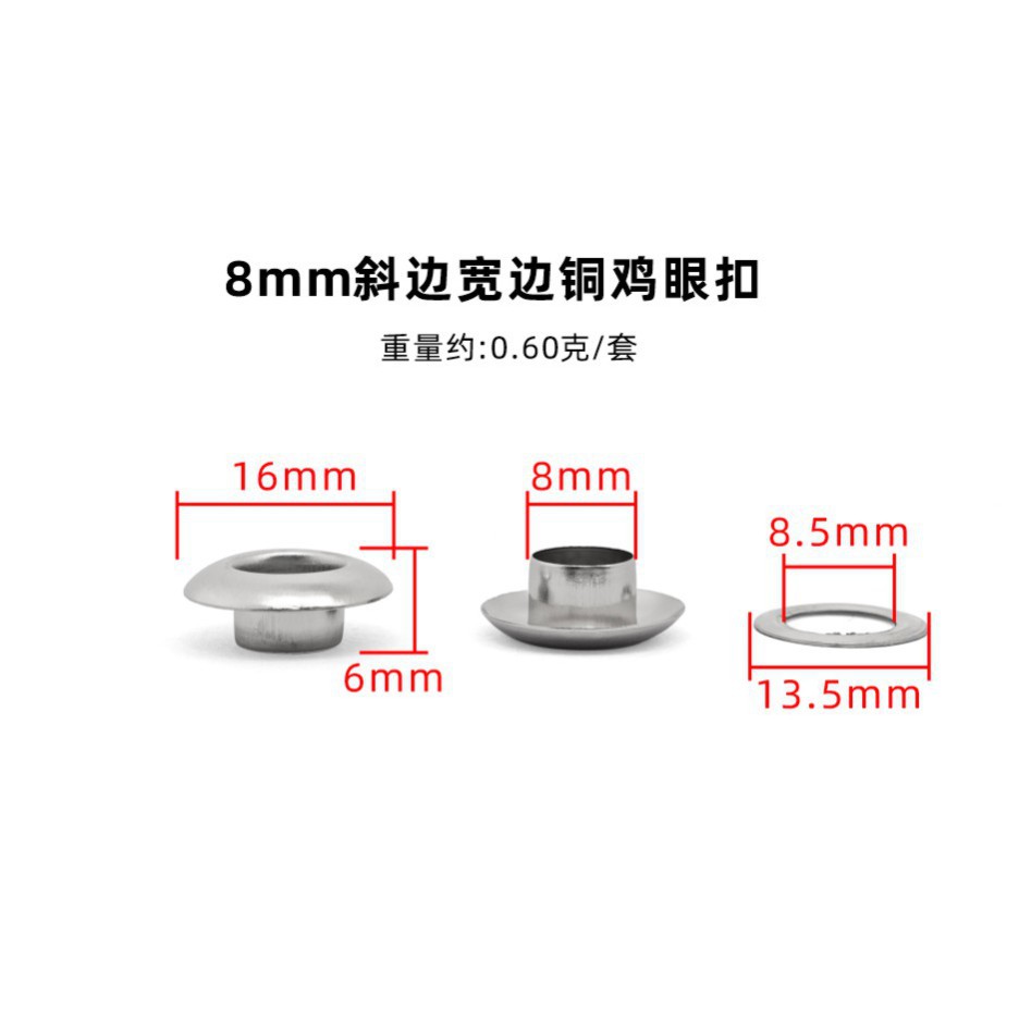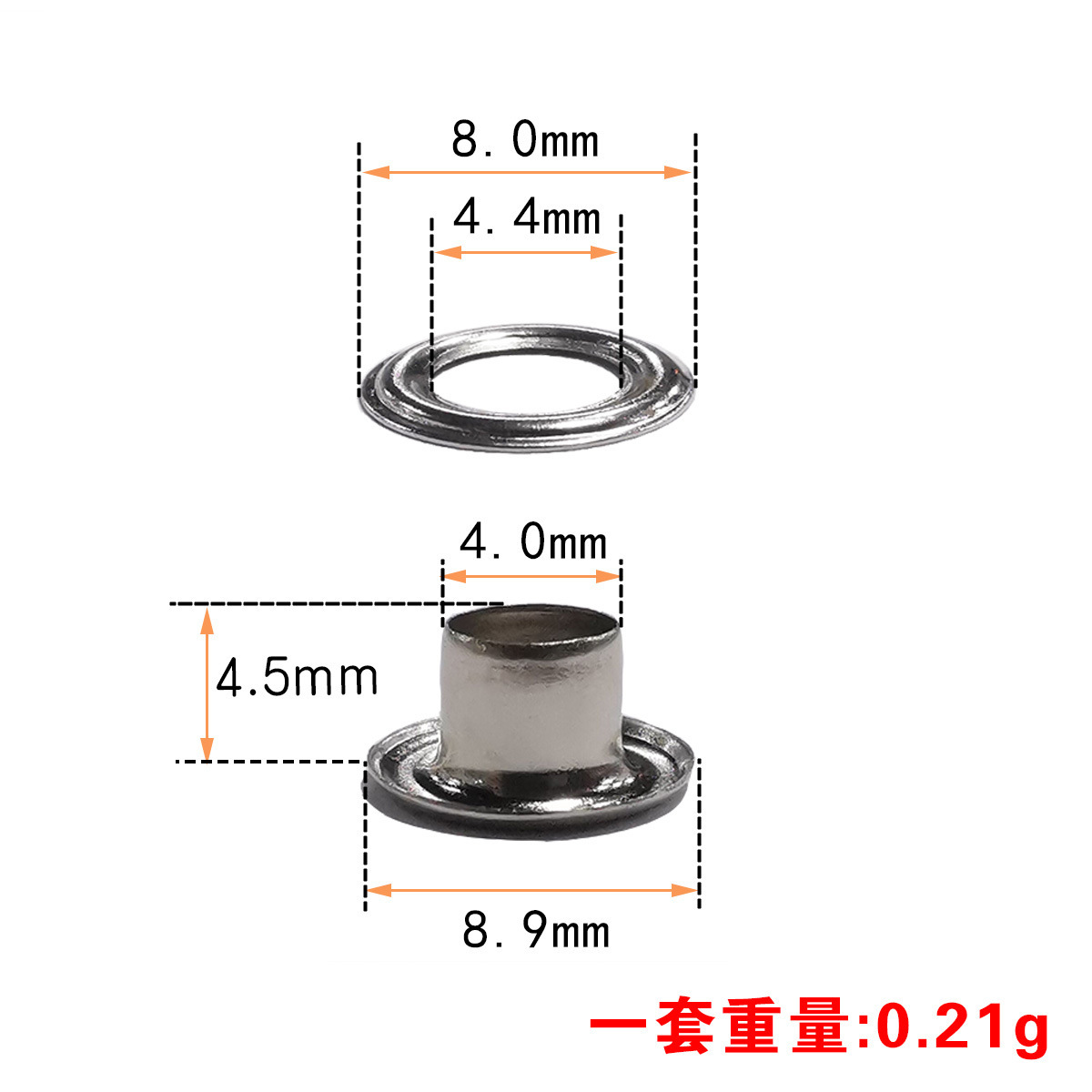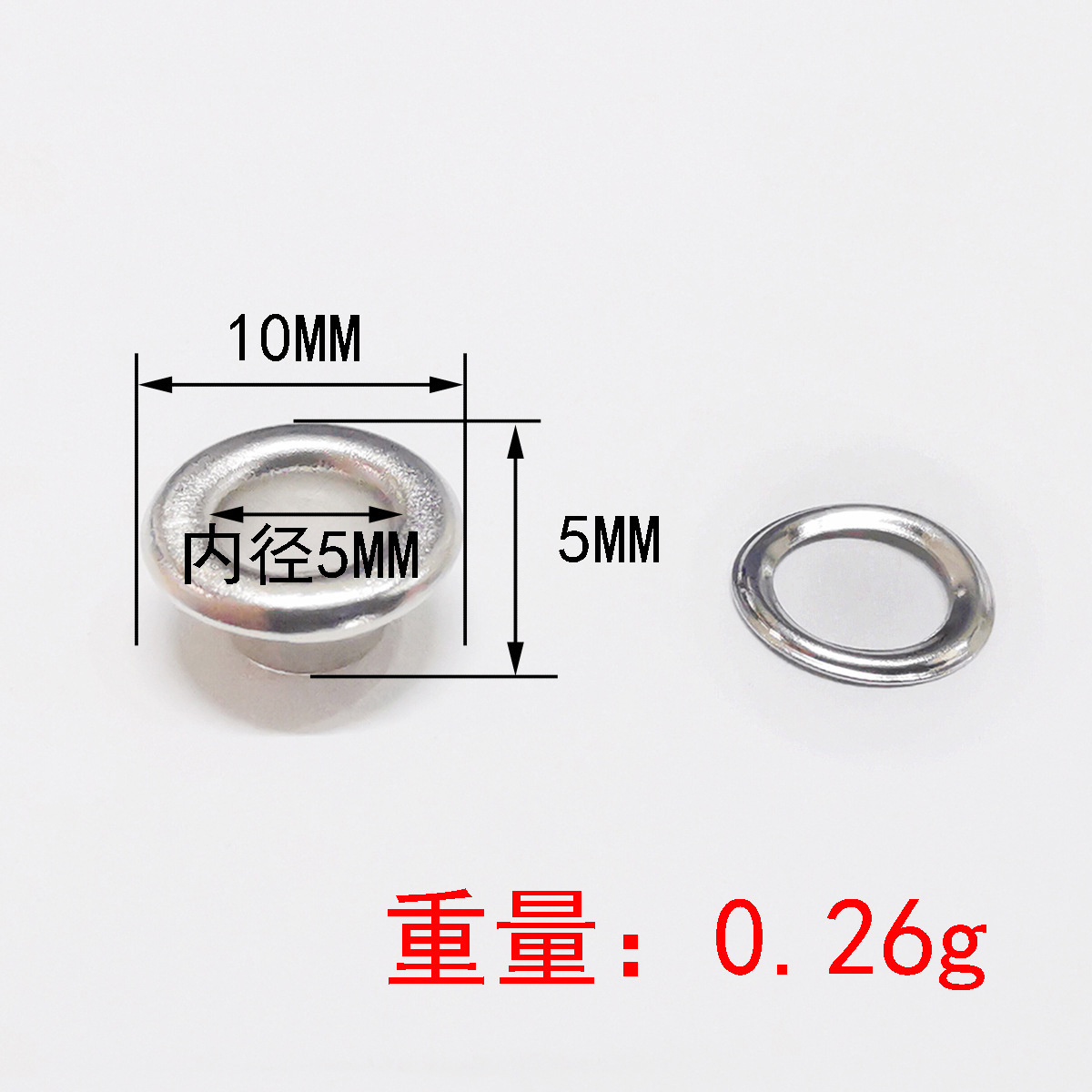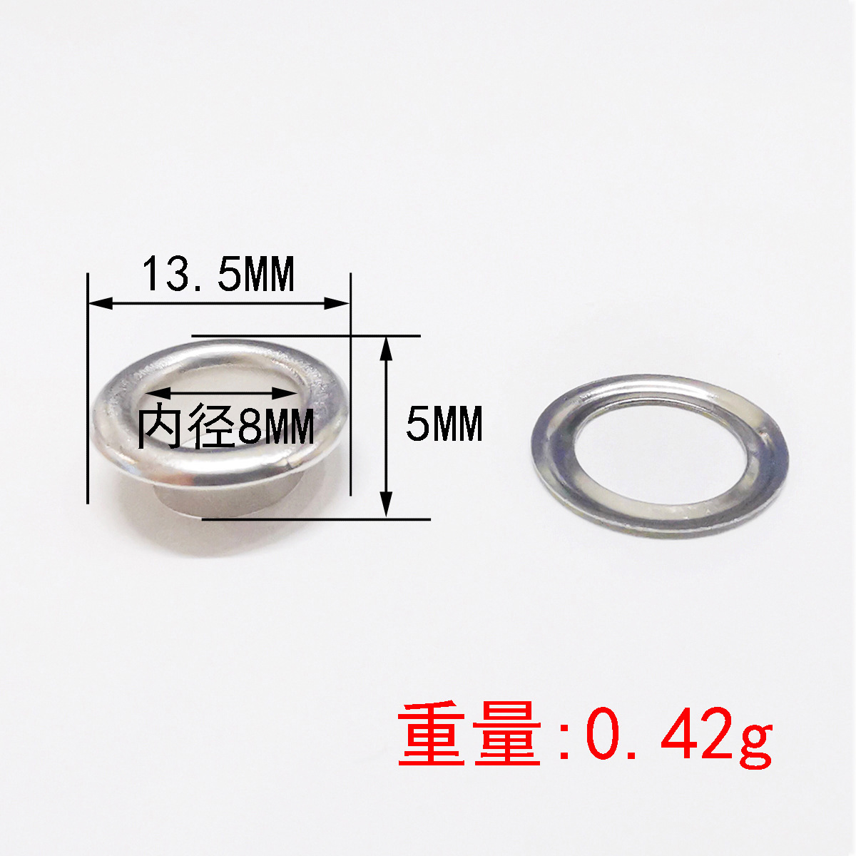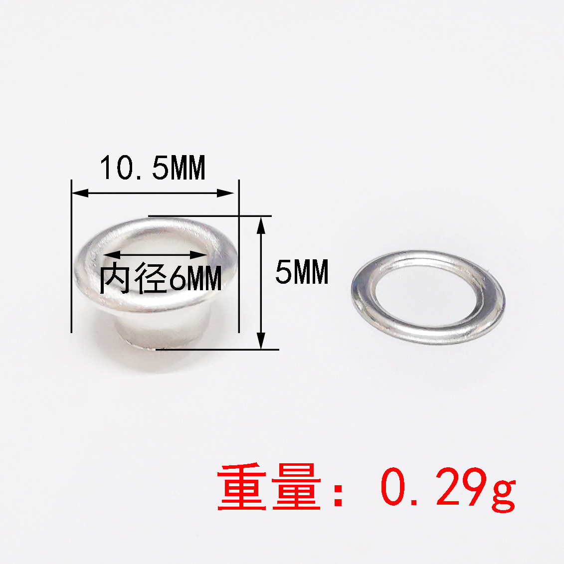 | 国标号 | 内径d1 | 外径dk | 总高度 | 鸡眼重量 | 垫片重量 | 一套重量 | 彩色鸡眼 | 圆边铁鸡眼 | 圆边铜鸡眼 | 压边鸡眼铜 |