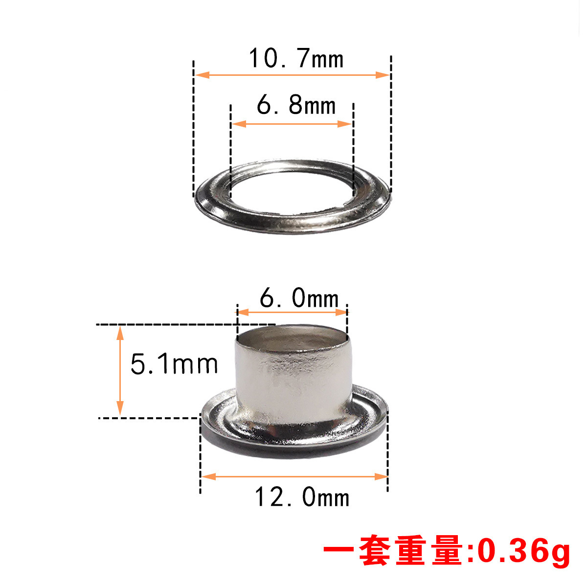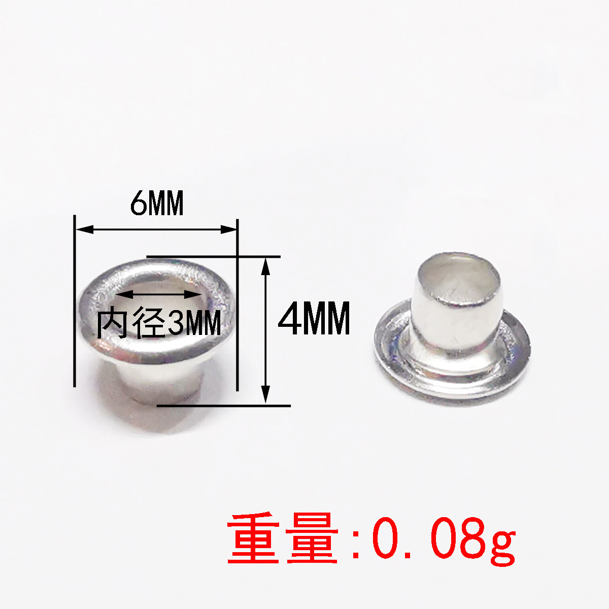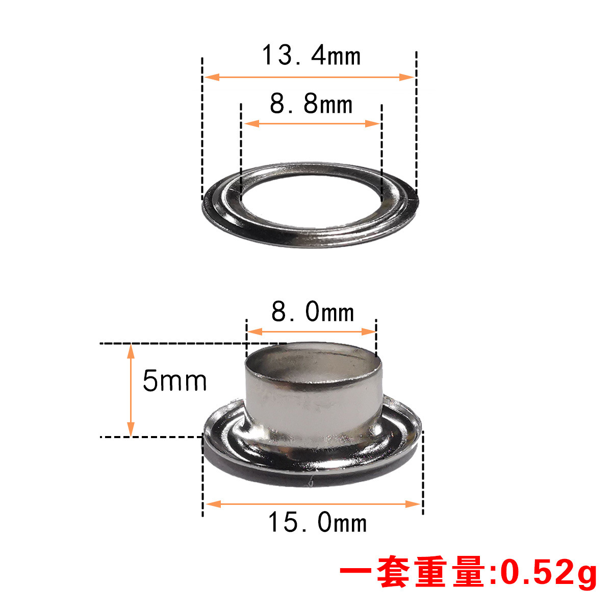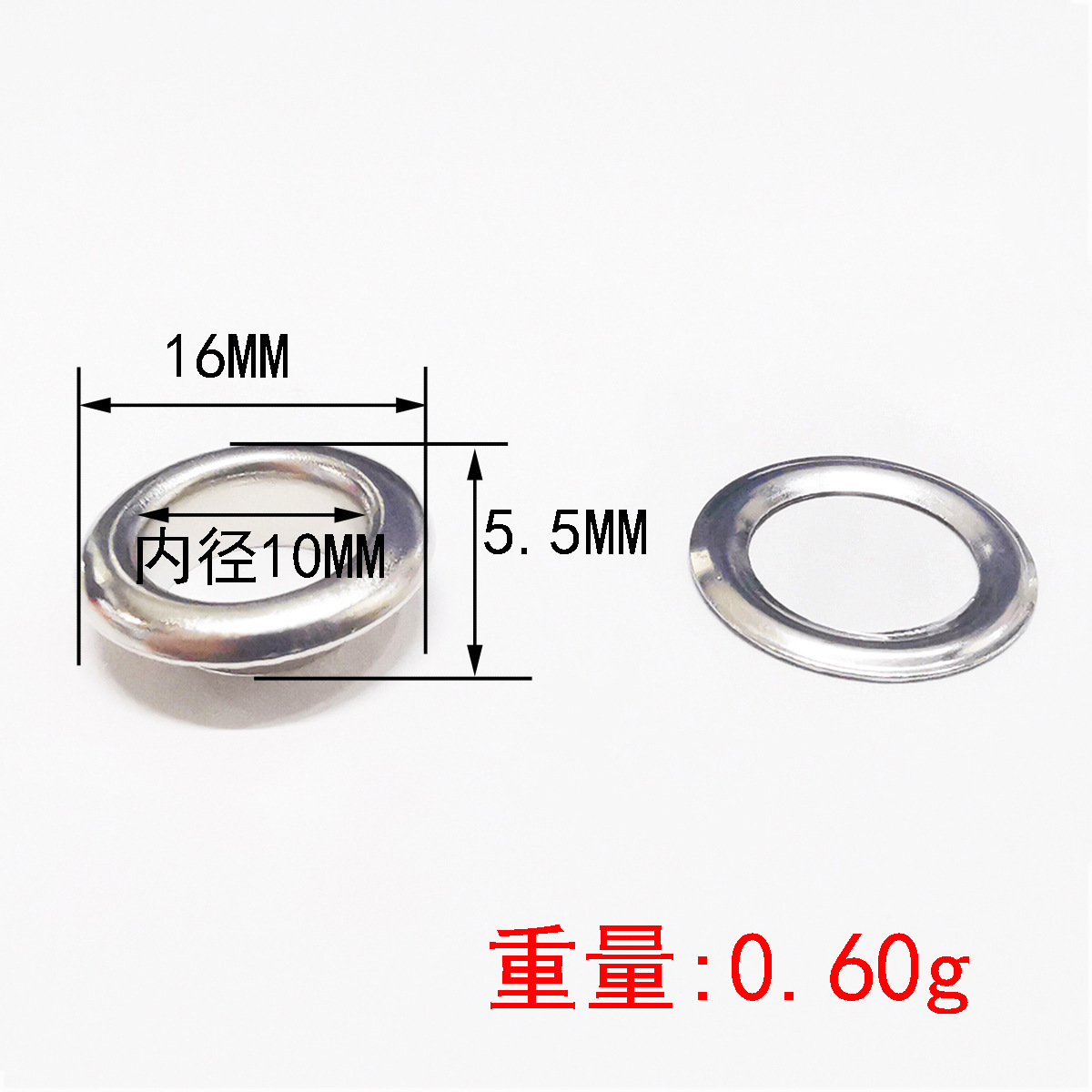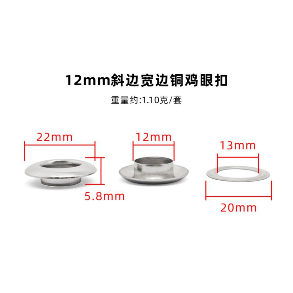 | 国标号 | 内径d1 | 外径dk | 总高度 | 鸡眼重量 | 垫片重量 | 一套重量 | 彩色鸡眼 | 圆边铁鸡眼 | 圆边铜鸡眼 | 压边鸡眼铜 |