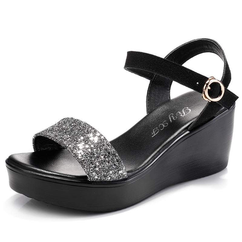 Босоножки на танкетке женские Корейская версия 2022 новые летние модные туфли на высоком каблуке с пайетками больших размеров