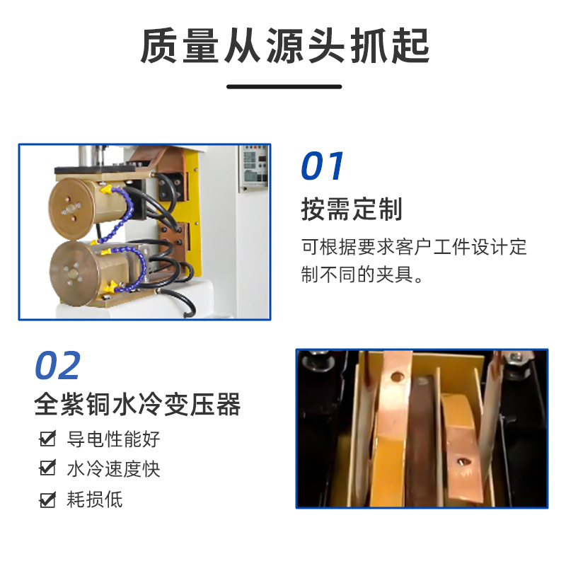 配置多种电阴焊接控制器,设有多路分别冷却水路以及可调节器行程加压机构。