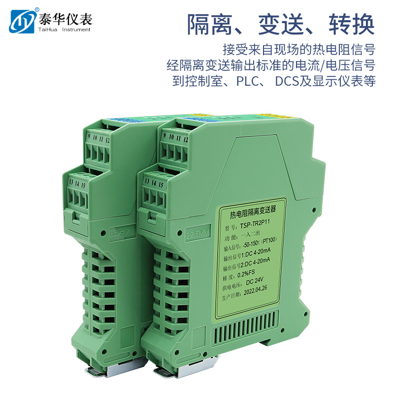 接收来自现场的热电阻信号,经隔离变送输出标准的电流/电压信号到控制室、PLC、DCS及显示仪表等。