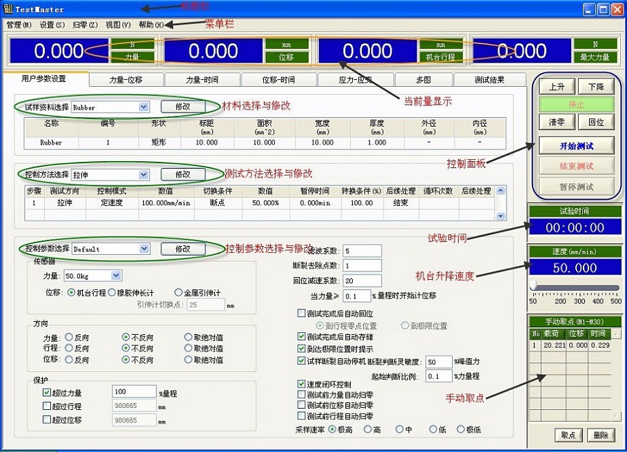 本机可显示力量较大值,力量较小值,断裂值,上下屈服强度、抗拉强度、抗压强度、弹性模量、延伸率、剥离区间较大值、较小值、平均值等