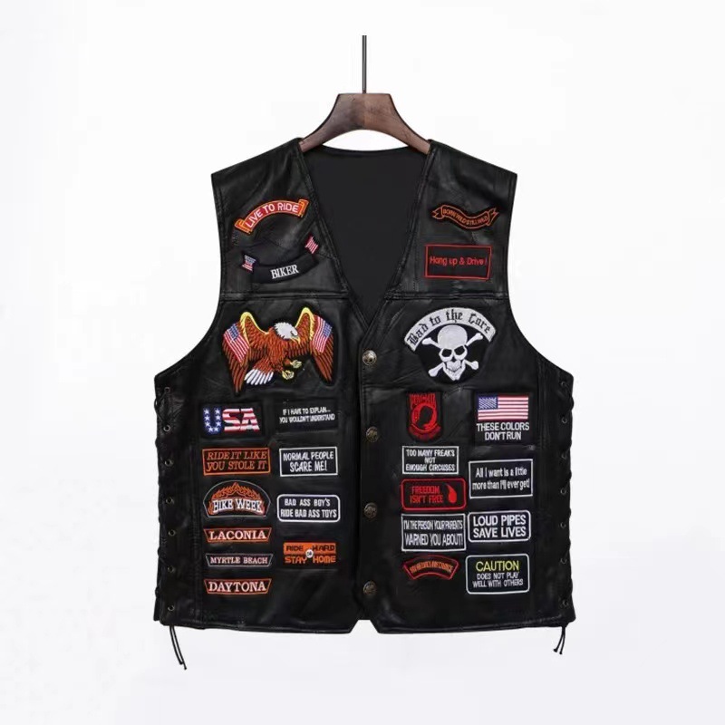 Европейский и американский модный мотоциклетный жилет, кожаный жилет, мужской кожаный жилет с вышитым значком, чистая версия, различные жилеты
