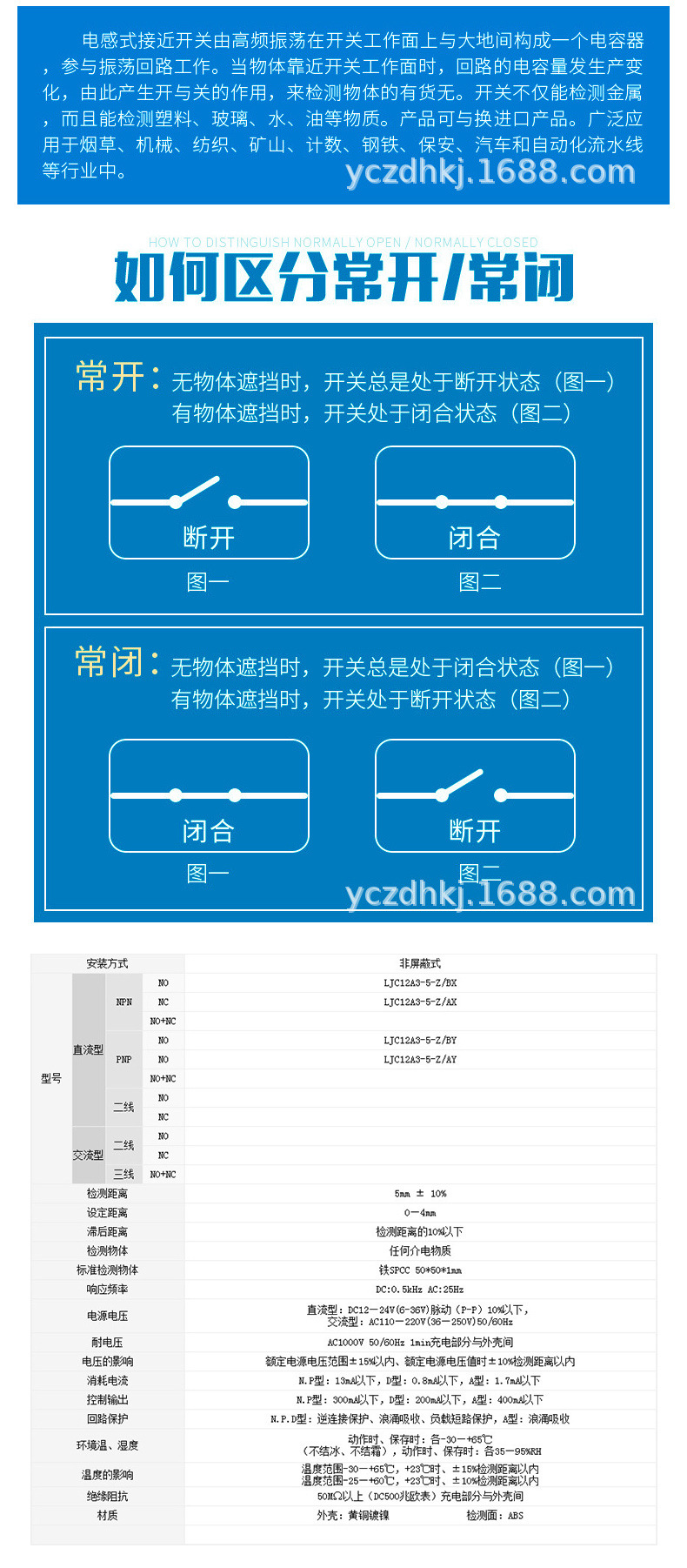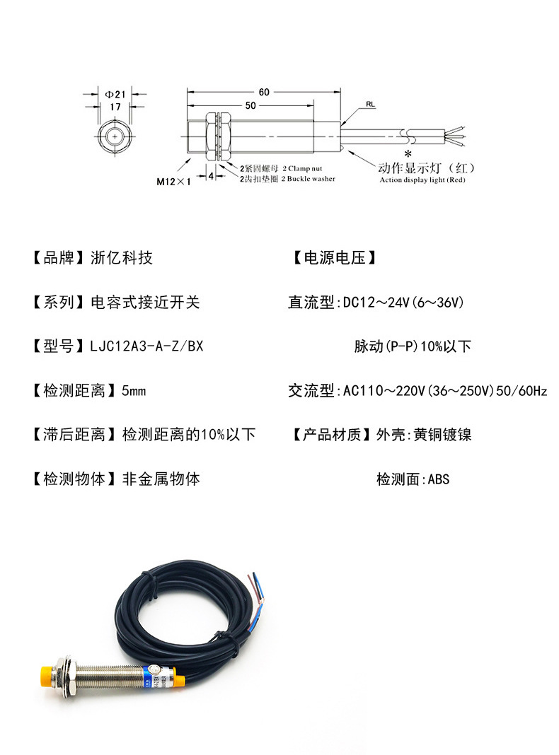 Бесконтактный емкостный датчик приближения LJC12A3-A-Z/BX, тип DC, NPN, нормально открытый, Zhiyi Technology Electronics, IP65
