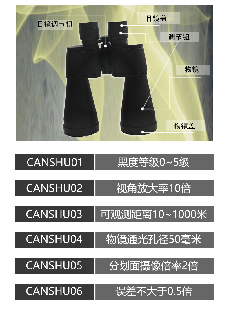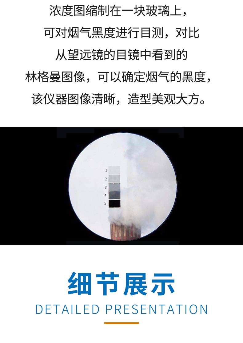 本仪器采用双目棱镜望远系统,而在望远镜分划板上制有相应林格曼烟气浓度图1-5级的灰度阶梯块,全透明部分则为0级、观测者通过望远镜左侧目镜将烟尘目标与该级灰度阶梯块比较,从而测定烟气黑度标准等级。