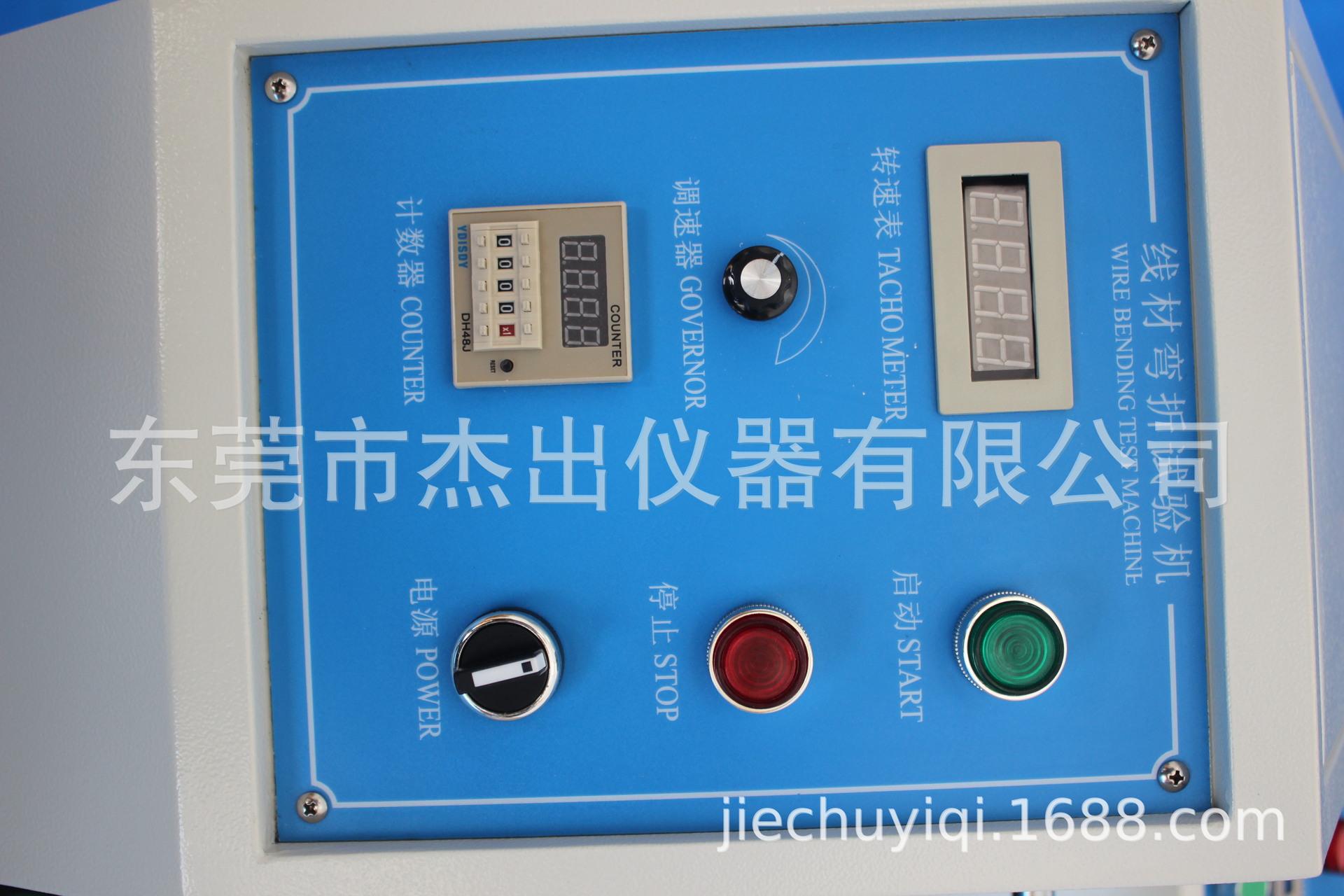 本机专门测试插头引出线及线缆之耐折强度;速度采用传光电传感器采集信号传给数字显示表,直接调节无极调速器便可读出数值.试验方法:试法是将试料固定在夹具上,并加上一定荷重,夹具左右摇摆,经一定次数后,检查其断线率,或至无法通电时,查看其总计数次数,能自动停止工作;