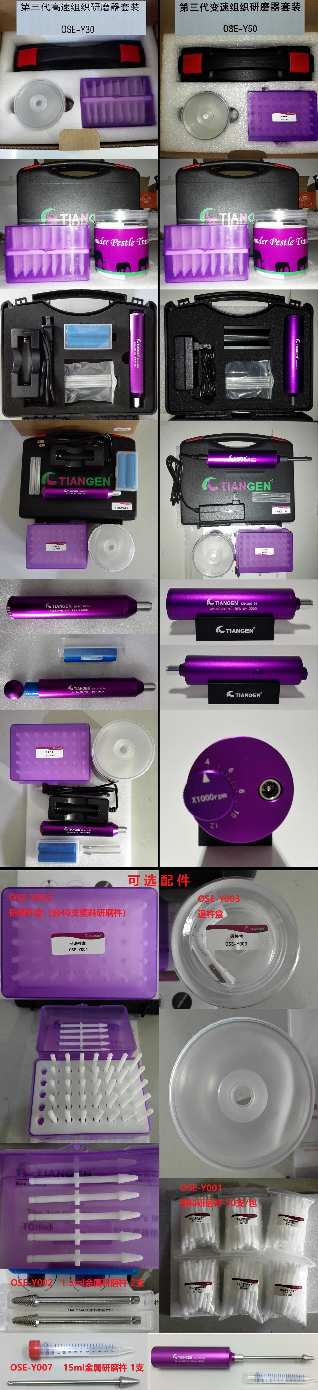 OSE-Y30套装:动力强劲,适用于大脑、心脏、肺、肝脏、肾脏、肠、淋巴结、肌肉等动物组织样品和根、茎、叶、花、果实、种子等植物组织样本。套装配有研磨杵盒,可整盒灭菌,直插式装头。一按式卸头不会污染环境及其他样本。