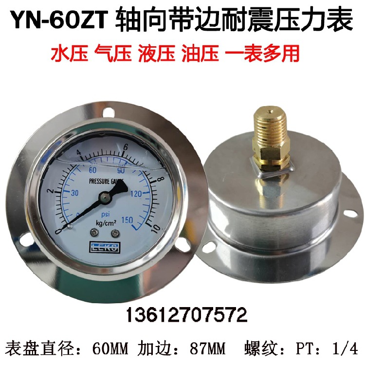 规格型号:YN-60ZT轴向带边耐震压力表