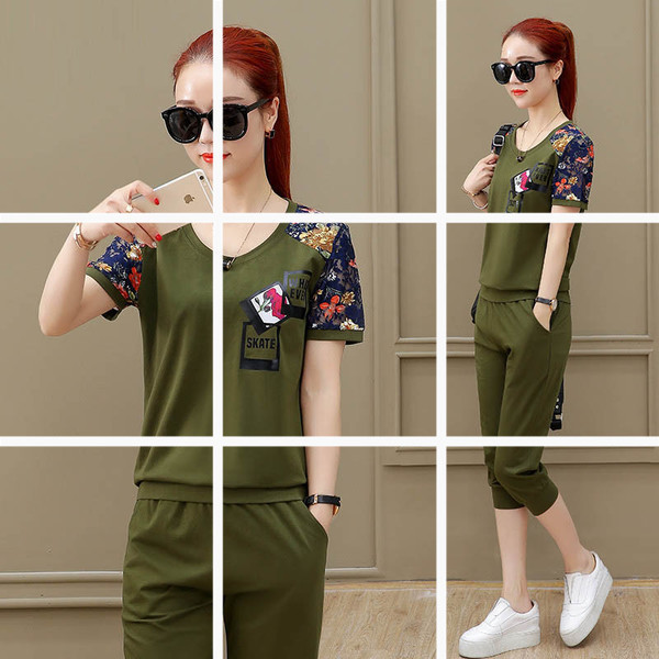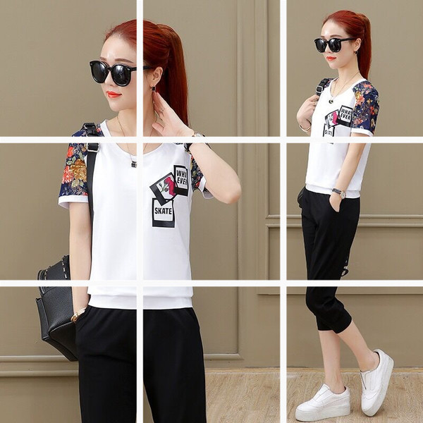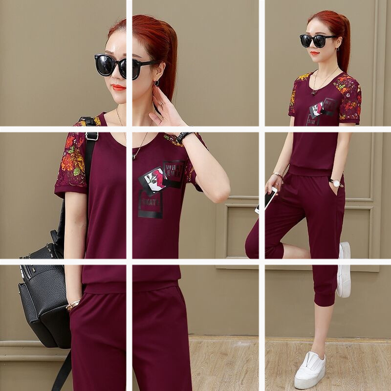2019 весна и лето новый спортивный костюм женский корейский толстый MM повседневный бег с короткими рукавами, укороченные брюки из двух частей женский набор