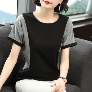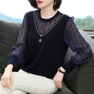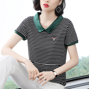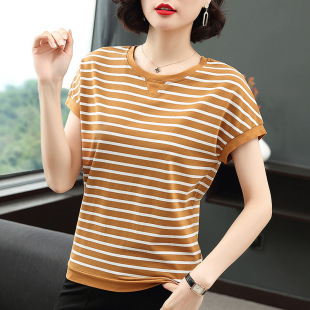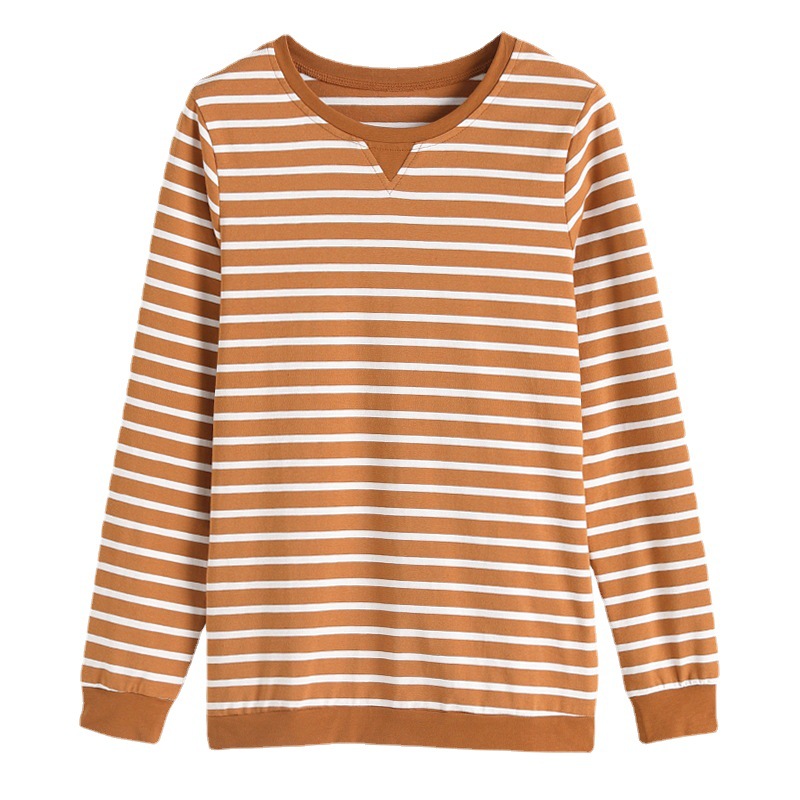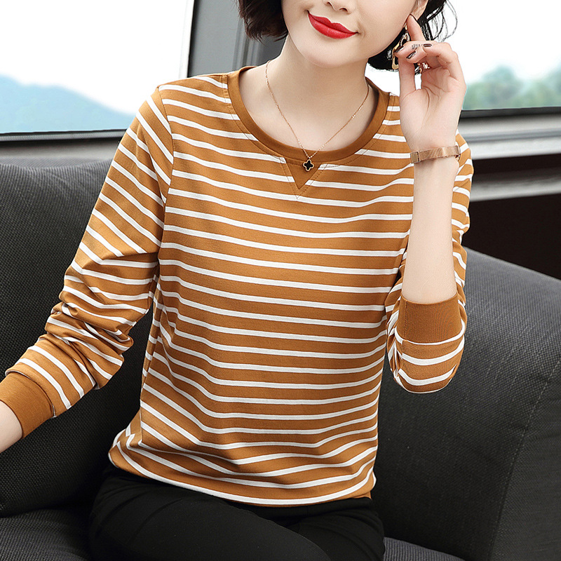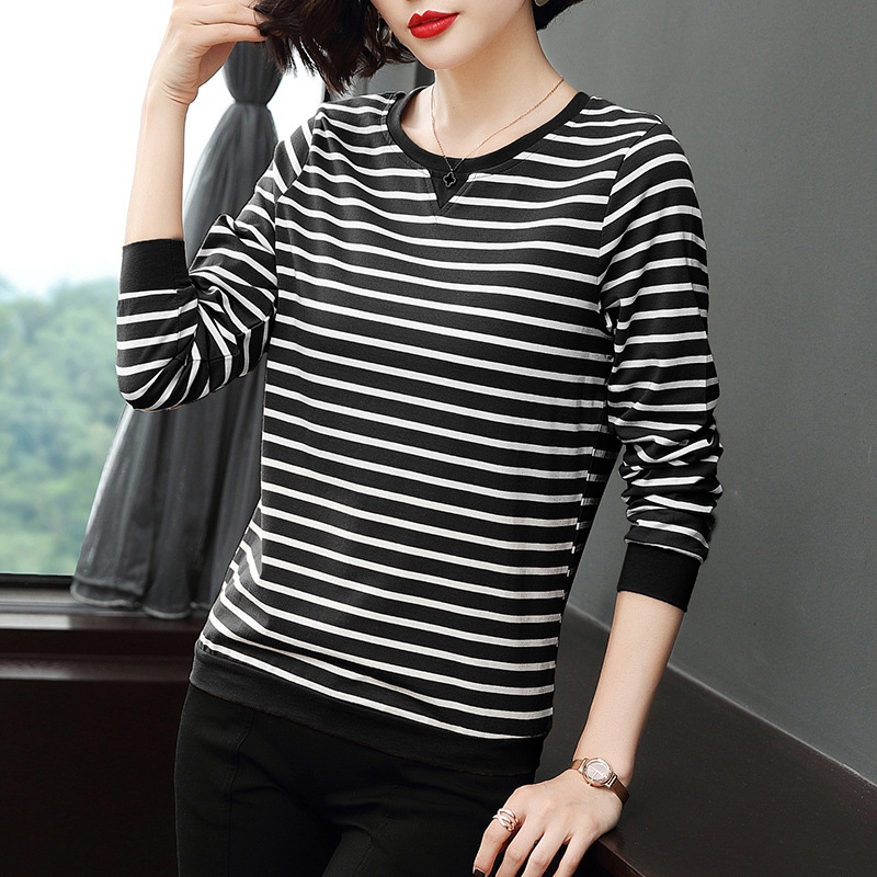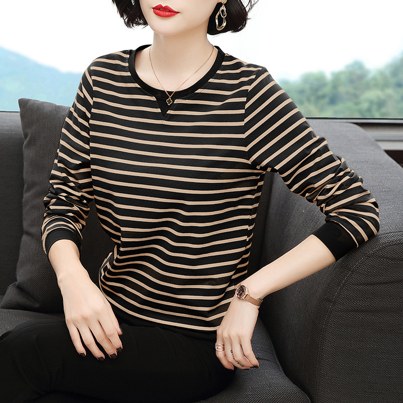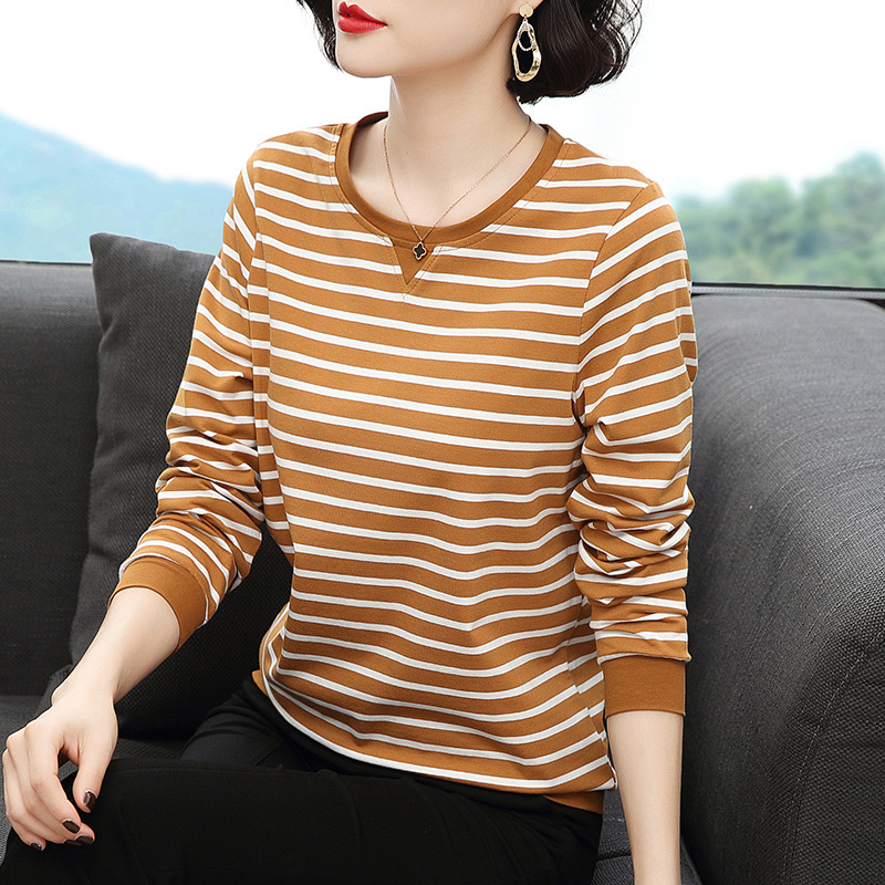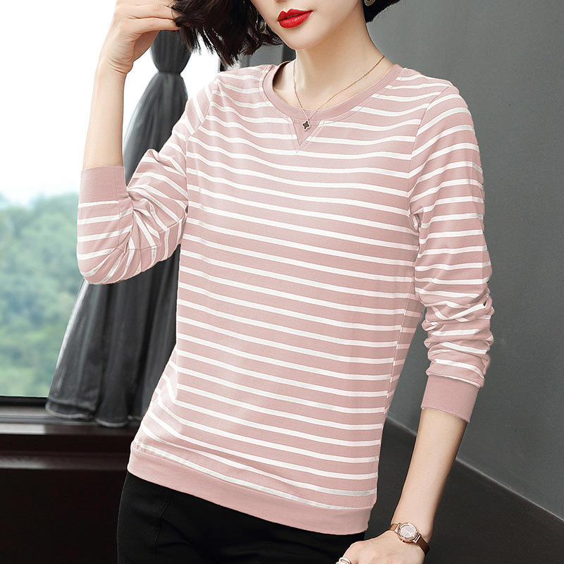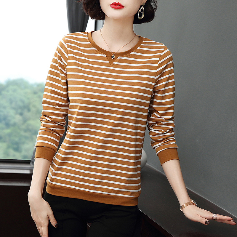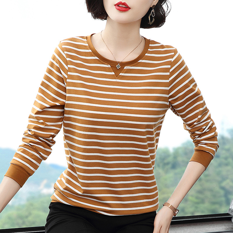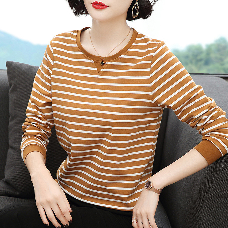 Хлопковая футболка с длинными рукавами, женская новая свободная верхняя одежда 2023 года, универсальный топ в полоску, Базовая рубашка для матери среднего возраста