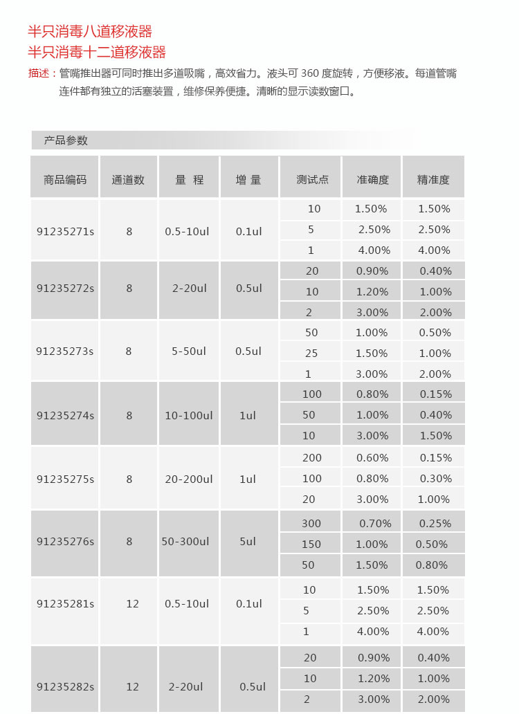Один канал (половина дезинфекции) 0,1-2,5 мкл; Один канал (половина дезинфекции) 0,5-10ul; Один канал (половина дезинфекции) 2-20ul; Один канал (половина дезинфекции) 5-50ul; Одиночный канал (половинное обеззараживание) 10-100ul; Один канал (половина дезинфекции) 20-200ul; Одиночный канал (половинное обеззараживание) 100-1000ул; Один канал (половина дезинфекции) 1000-5000ul; Один канал (половина дезинфекции) 1-10 мл; Половина-ветка дезинфекции пипетка 0,5-10ul; Половина-ветка дезинфекции пипетка 2-20ul; Половина-ветка дезинфекции пипетка 5-50ul; Половина-ветка дезинфекционная пипетка 20-200ul; Половина-ветка дезинфекции пипетка 30-300UL; Половина-ветка дезинфекционная пипетка 50-300UL; Половина дезинфекции двенадцать пипеток 0,5-10ul; Половина дезинфекции двенадцать пипеток 2-20ul; Половина дезинфекции Двенадцать пипеток 5-50ul; Половина дезинфекции Двенадцать пипеток 20-200ul; Половина дезинфекции Двенадцать пипеток 30-300ul; Половина дезинфекции двенадцать пипеток 50-300ul