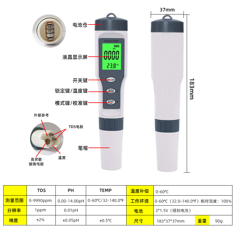 外贸品质三合一ph计meter现货tds水质检测笔多功能背光ph测试笔