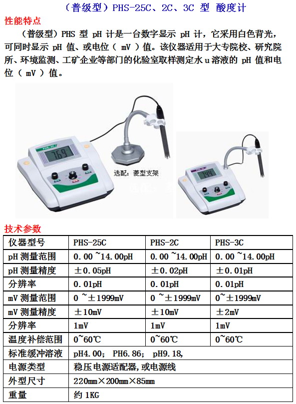 PHS型数显酸度计是用于实验室测量PH值的高精度仪器,具有pH,mV双重功能。采用E201型复合电极,反应快,稳定性好。该系列仪器广泛用于科研、教学、农业等许多学科和领域。