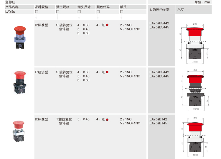BS541 аварийный стоп самоблокирующийся красный 1НО; BS542 аварийный стоп самоблокирующийся красный 1NC; BS545 аварийный стоп самоблокирующийся красный 1НО + 1НЗ