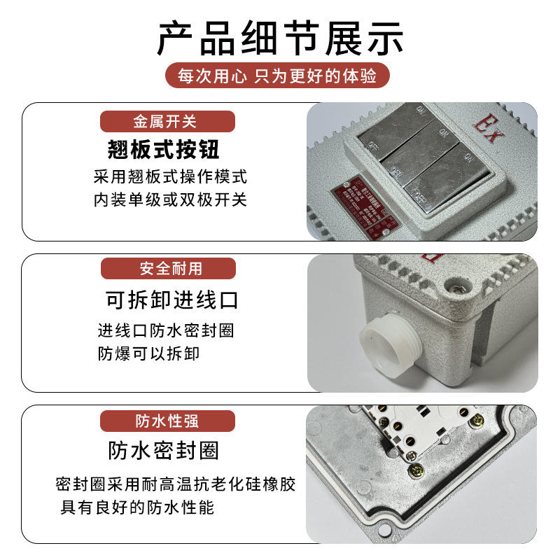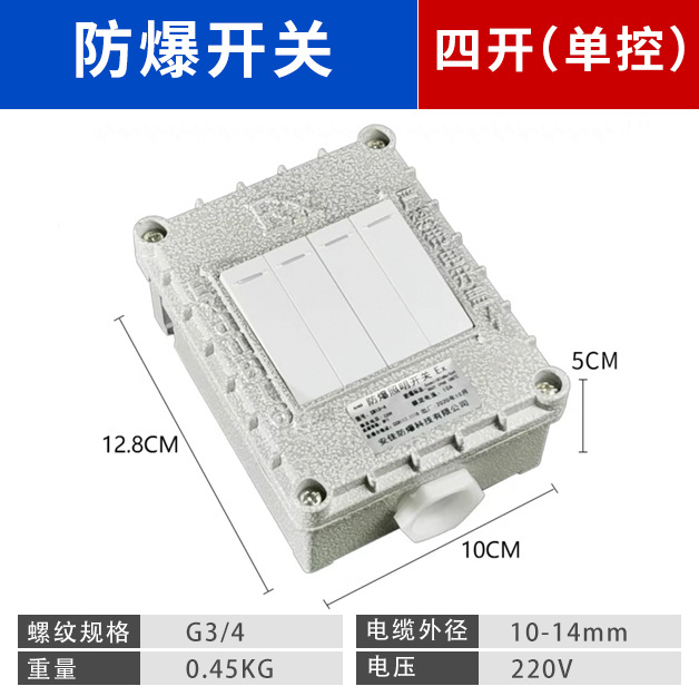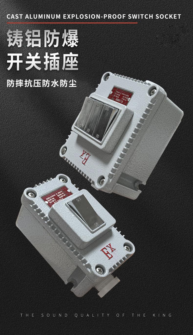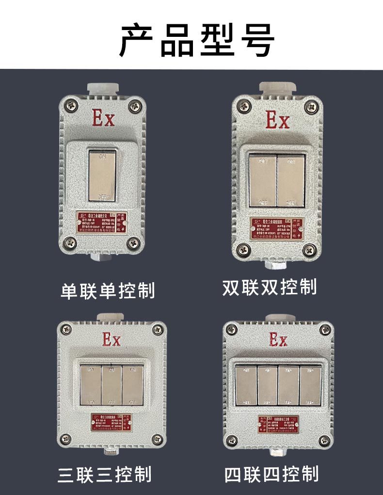 Однополюсный одноклавишный (SPST) взрывозащищённый переключатель; Двухпозиционный взрывозащищённый выключатель с одноклавишным управлением; Трёхпозиционный взрывозащищённый выключатель с одноклавишным управлением; Четырехпозиционный взрывозащищенный переключатель с одним управлением; Однополюсный двухпозиционный взрывозащищенный переключатель; Двухпозиционный взрывозащищённый переключатель с двойным управлением.; Трехпозиционный взрывозащищенный переключатель (три положения, два выключения); Четырехпозиционный взрывозащищенный переключатель с двойным управлением; Взрывозащищенный переключатель с ручкой на 220 В; 380В взрывозащищённый поворотный переключатель; 220В взрывозащищённый поворотный переключатель [утолщённый]; 380В взрывозащищённый поворотный переключатель [утолщённый]; Взрывозащищённый одноклавишный выключатель + пятиотверстная розетка; Взрывозащищённая двойная крышка + пятиотверстная розетка; Взрывозащищённая розетка с тремя открытыми контактами и пятью отверстиями; Взрывозащищённая розетка с четырьмя открытыми контактами и пятью отверстиями; Взрывозащищенная одинарная розетка с пятью отверстиями; Взрывозащищенная одинарная трехконтактная розетка; Взрывозащищенная двойная розетка с пятью отверстиями; Взрывозащищенная двойная трехконтактная розетка; Взрывозащищенная тройная розетка с пятью отверстиями; Взрывозащищенная тройная розетка с тремя отверстиями; Взрывозащищенная четырехполюсная розетка с пятью отверстиями; Взрывозащищенная четырехсторонняя трехотверстная розетка