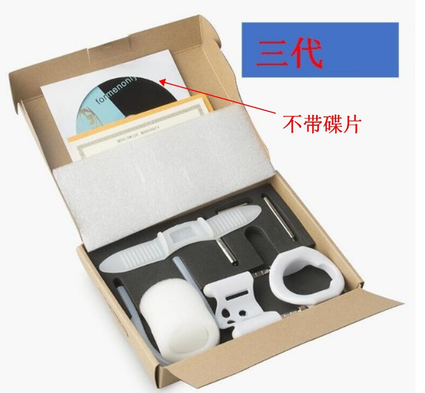 产品清单:1. Extender设备一个2.两个短杆3.两个长杆4.一个硅胶带和一个硅胶管5.一个舒适环6.DVD说明书保修卡7.记录尺寸表和说明书