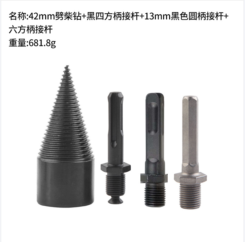Сверло для раскалывания дерева 32 мм; Сверло для раскалывания дерева 42 мм; Сверло по дереву 38 мм; Шестигранная ручка соединительный стержень; 3 сверла по дереву 42 мм + 3 вида ручек