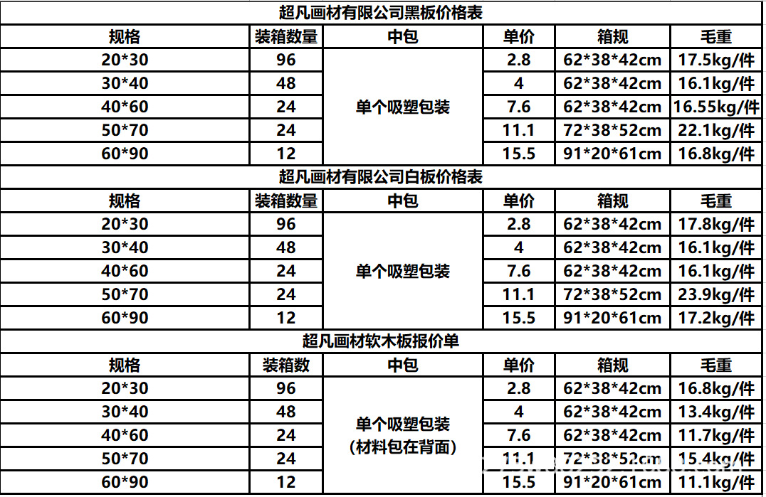 20 × 30; 30*40; 40 × 60; 50 × 70; 60 × 90; Доска 20*30 + белый железный лист (магнитное всасывание); Доска 30*40 + белый железный лист (магнитное всасывание)