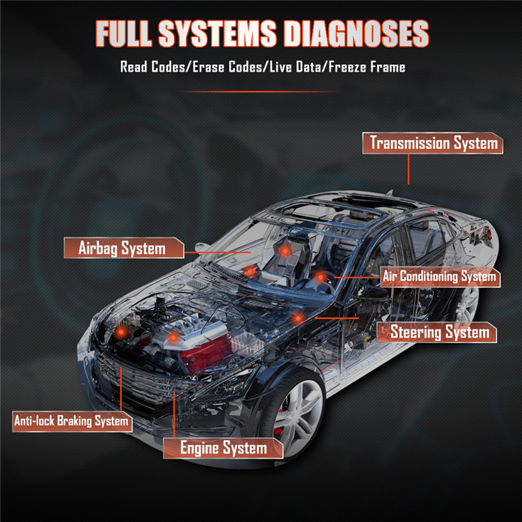 Ancel X7 10.1英寸平板电脑obd2扫描仪能够读取和清除所有主要系统的故障代码,包括引擎,安全气囊/ SRS,变速器,ABS,SAS,空调,ACC,音频,前大灯,中控锁,ESP,悬架故障等等。