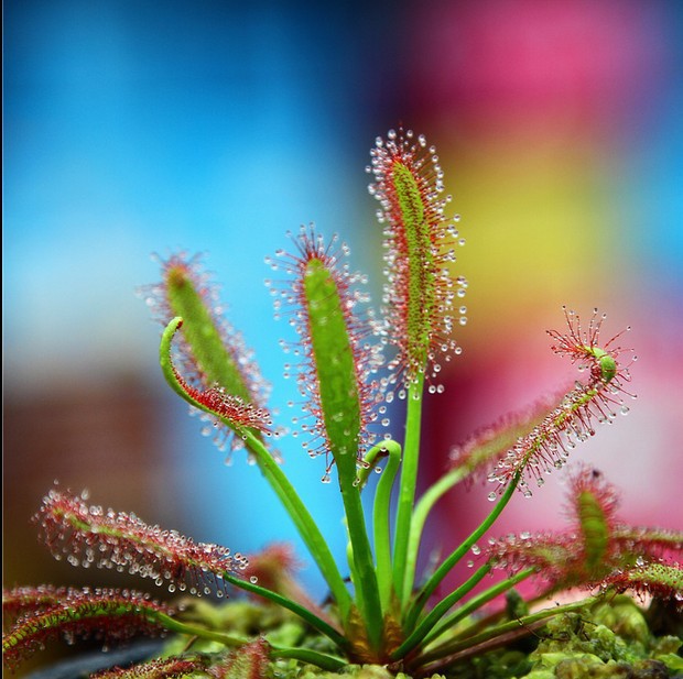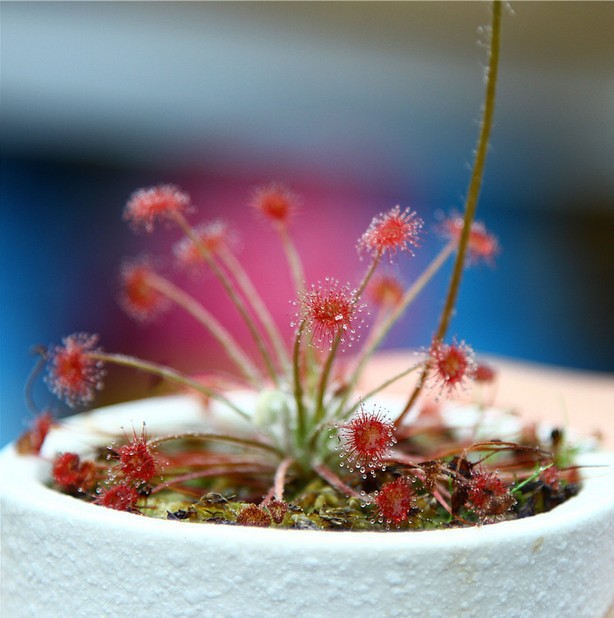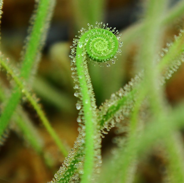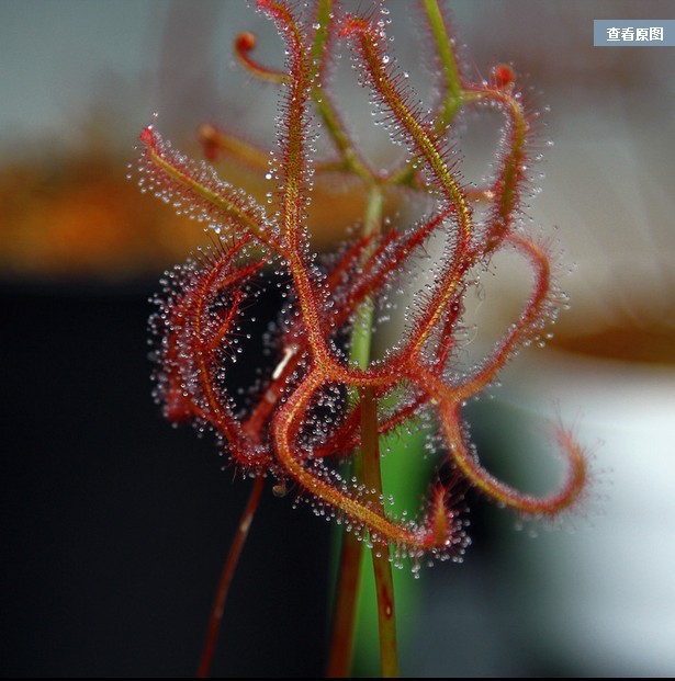茅膏菜是非常精致迷人的小型食虫植物,叶片上长有腺毛,能分泌粘液,外形象是挂满了露珠,晶莹剔透,能象粘纸一样把昆虫粘住,并消化吸收。
