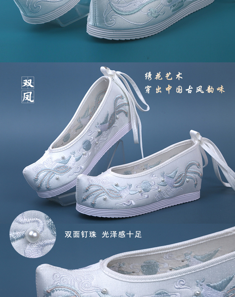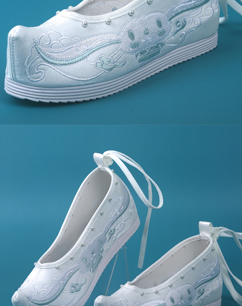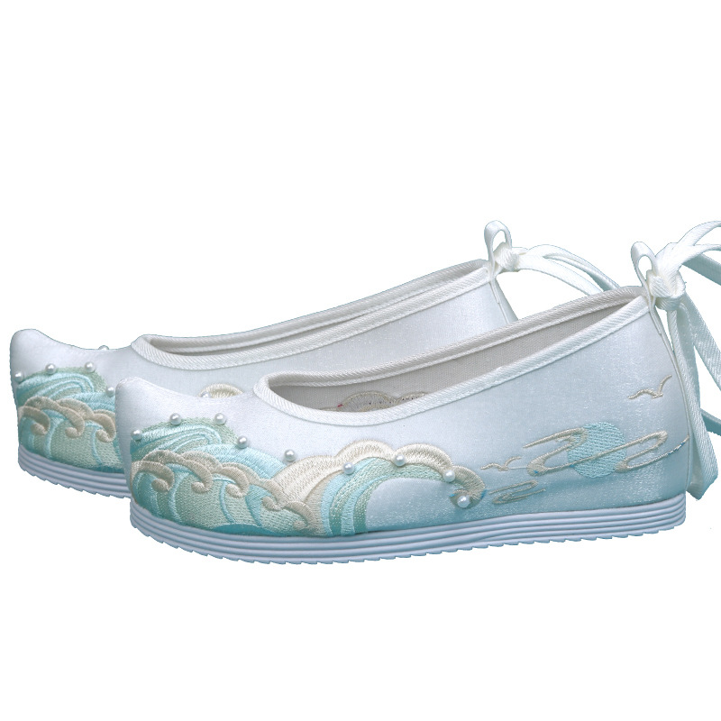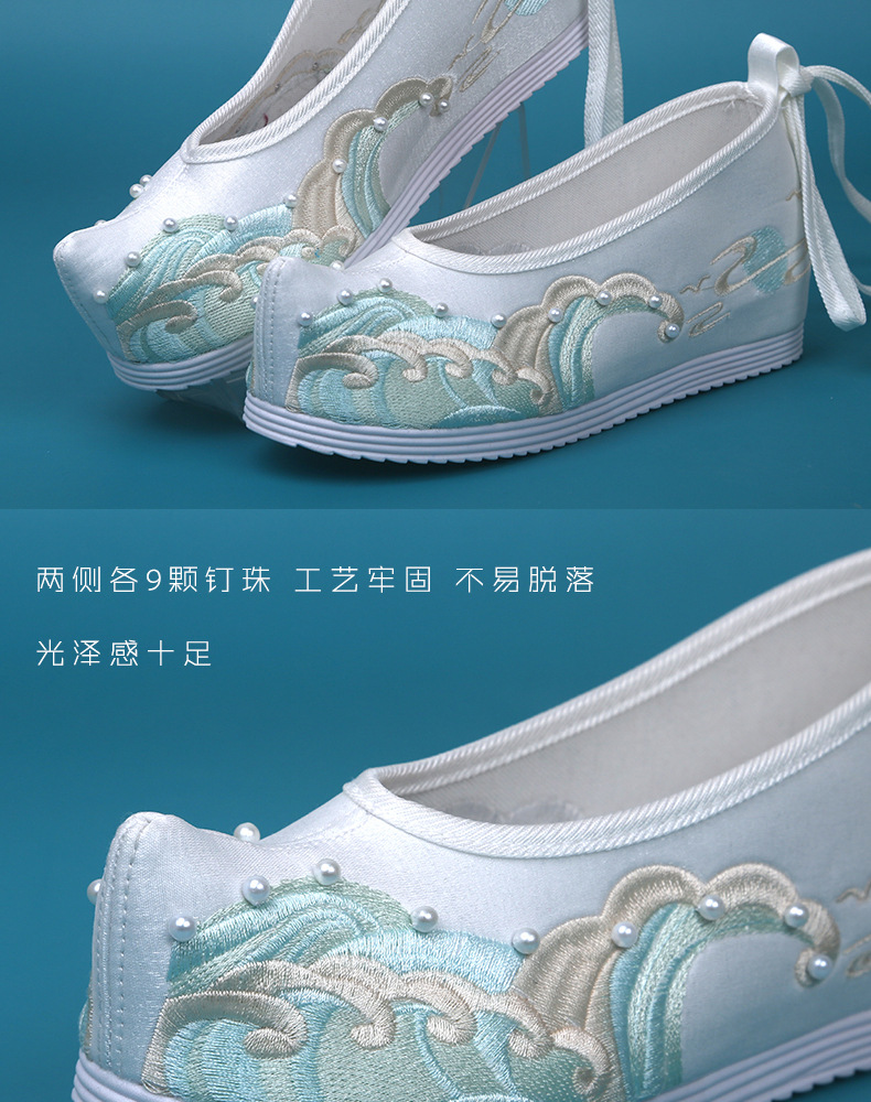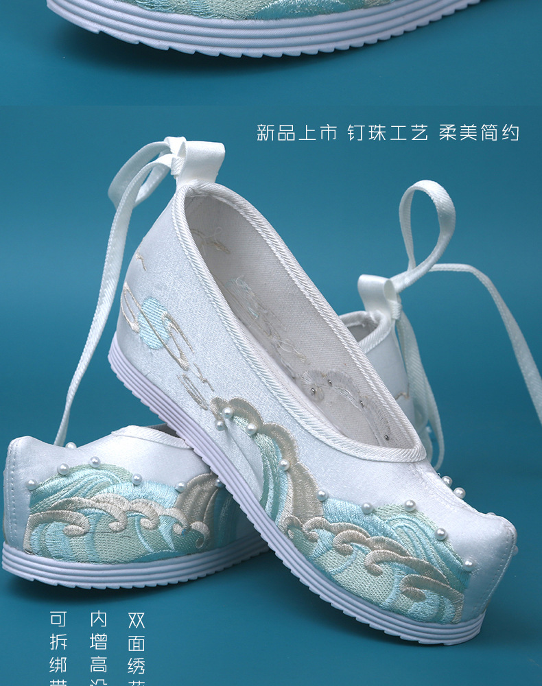 Новые туфли ханьфу с бисером, женская обувь с вышивкой в старинном стиле, старинная костюмная обувь на танкетке, обувь со скрытой высотой и поднятым бантом, весенне-осенняя Однослойная обувь