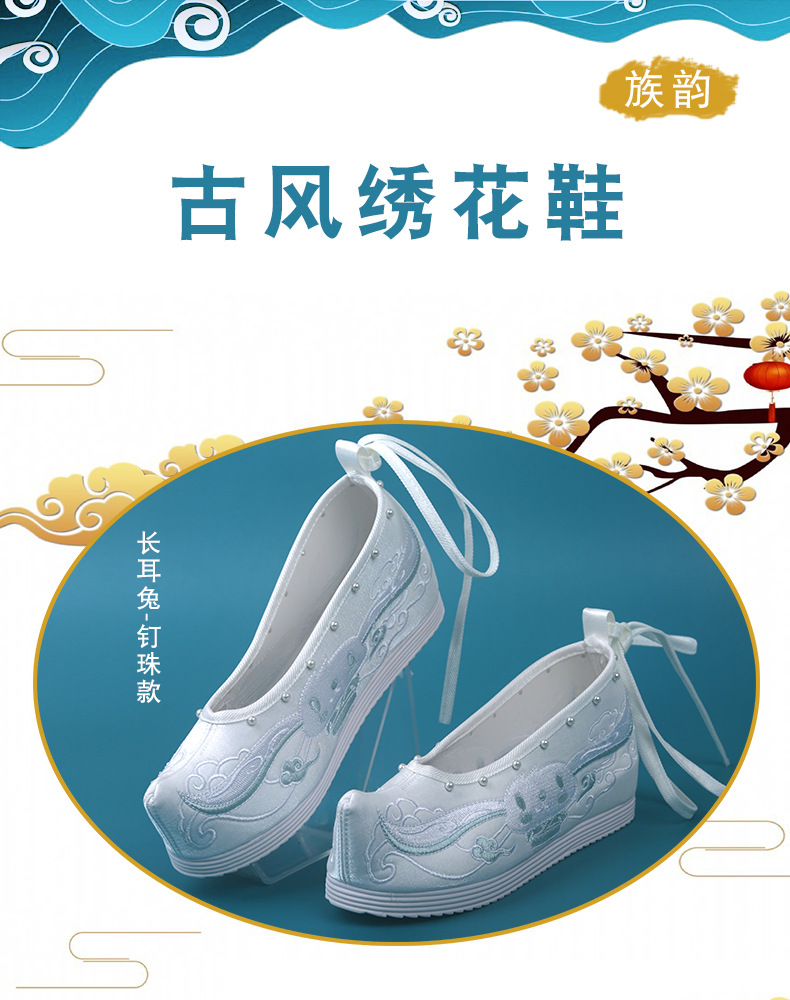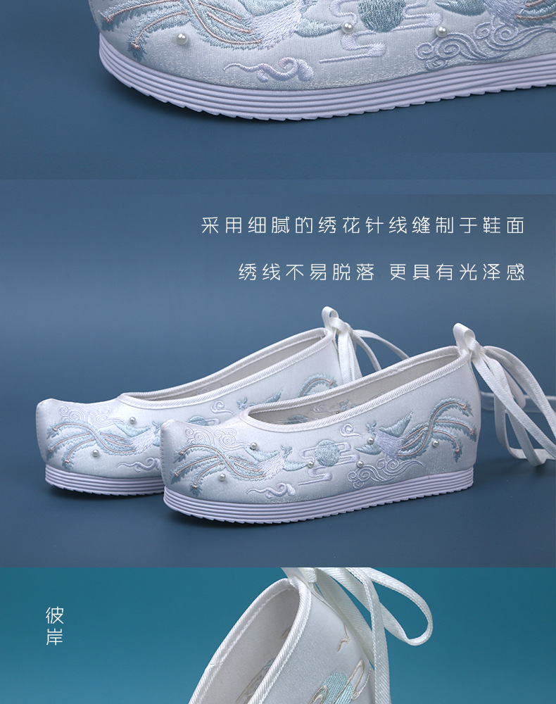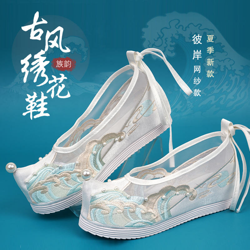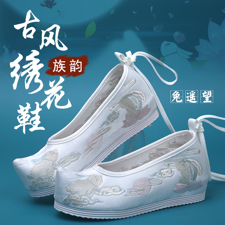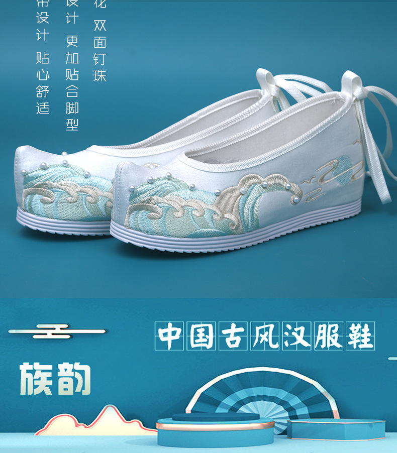 Новые туфли ханьфу с бисером, женская обувь с вышивкой в старинном стиле, старинная костюмная обувь на танкетке, обувь со скрытой высотой и поднятым бантом, весенне-осенняя Однослойная обувь