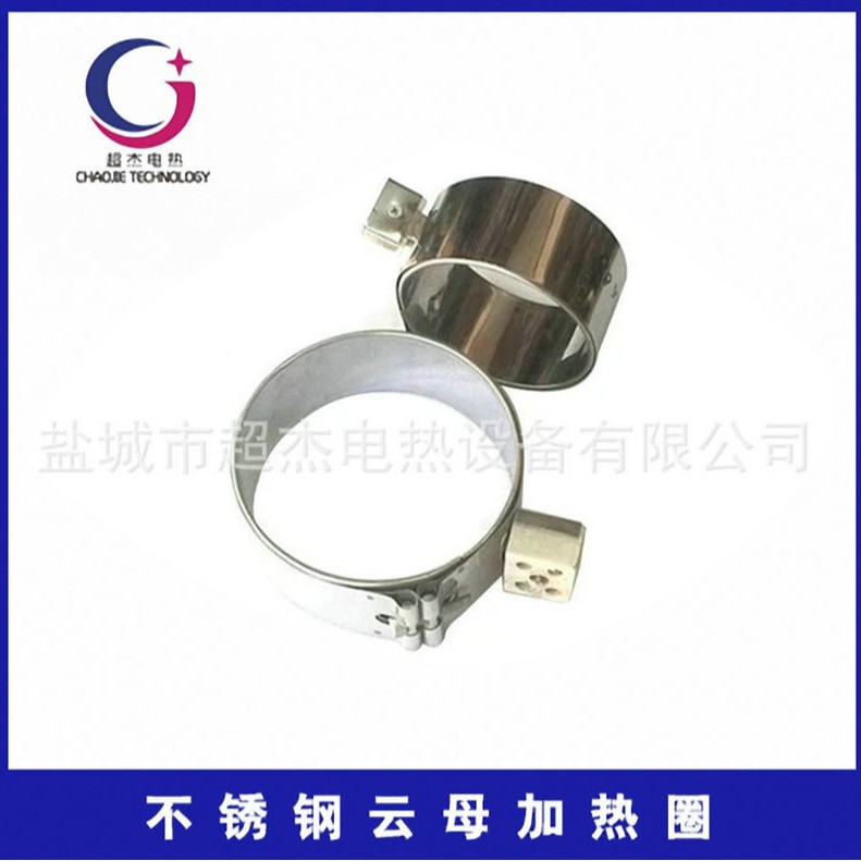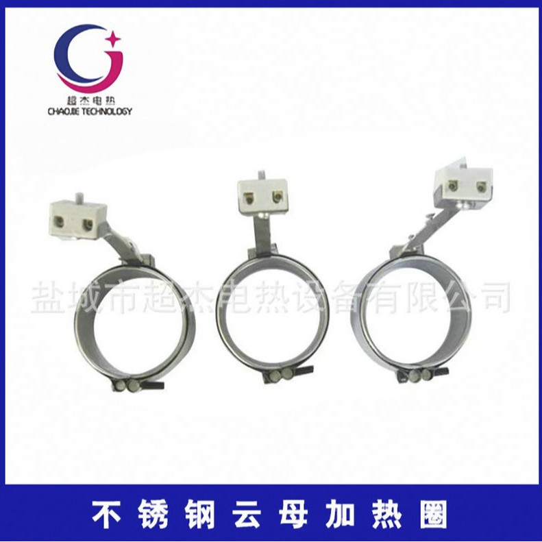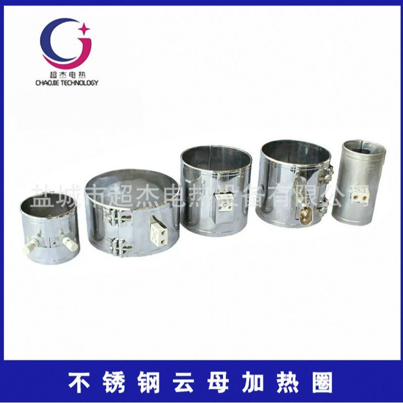 3、不锈钢电云母加热器以0.3~0.5mm不锈钢板或镀铝板为外壳,中间以高绝缘性耐高温的云母板为芯,均匀绕以各种标准规格的镍铬合金电阻丝作为发热体,经成型机加工成各式所需形状。可根据用户需求的接线方式,电压从110V、180V、220V、380V,功率负载每平方厘米3.5W。不锈钢云母加热器有圈形、锥形、板状等规格。