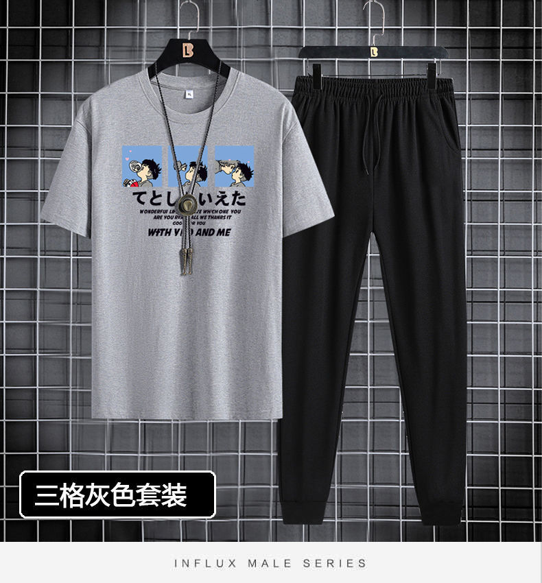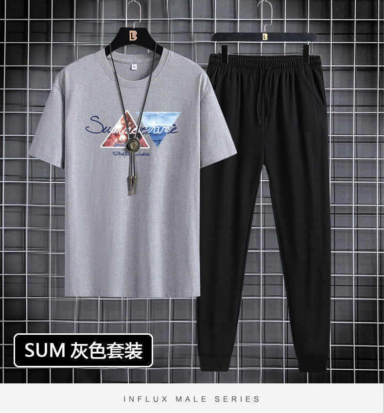 Мужской спортивный костюм с короткими рукавами и брюками, 2024, молодежный, повседневный, с круглым вырезом, с принтом, двухкомпонентный комплект, в корейском стиле