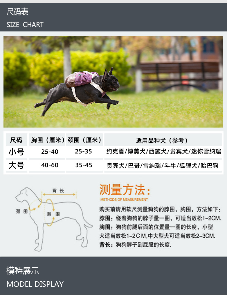 Маленький Размер: обхват груди 25-40 см, обхват шеи 25-35 см; Большой: обхват груди 40-56 см, обхват шеи 35-45 см