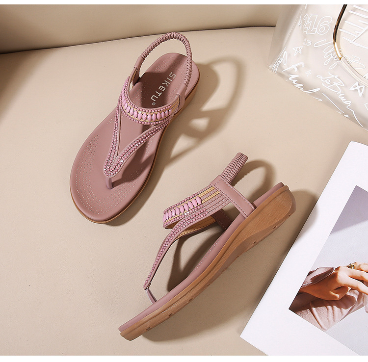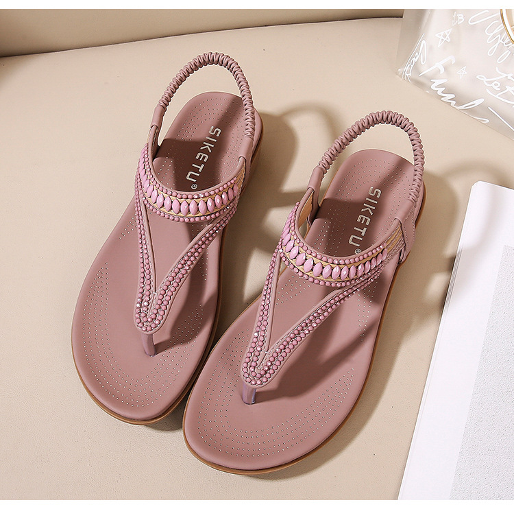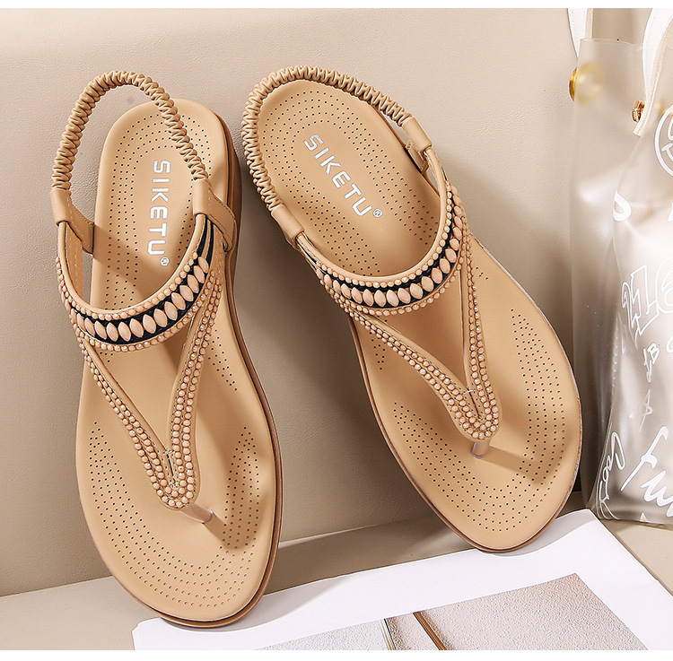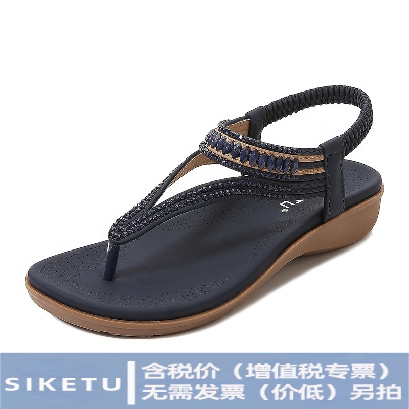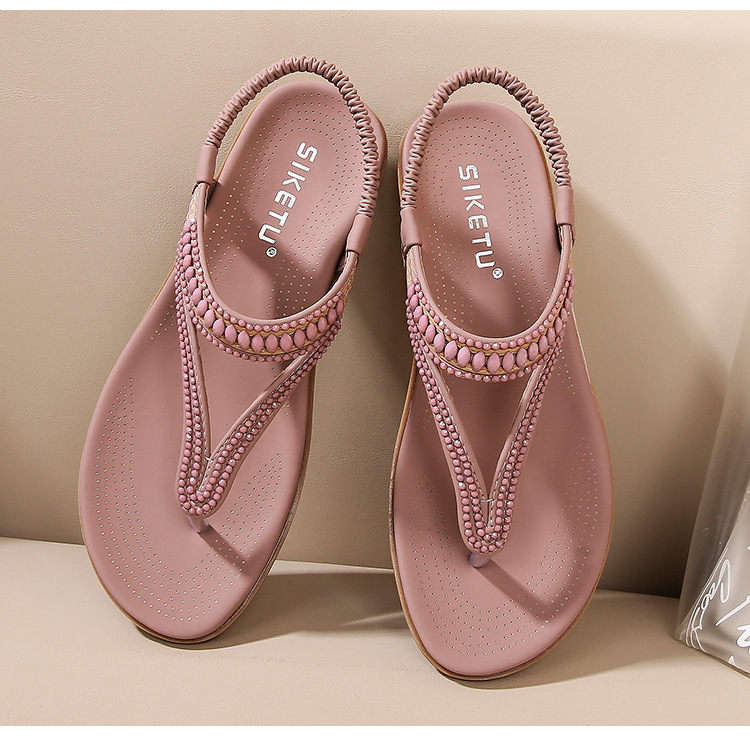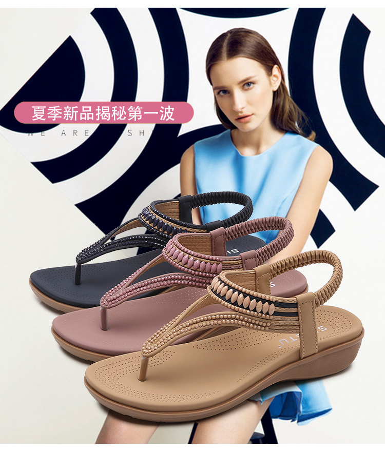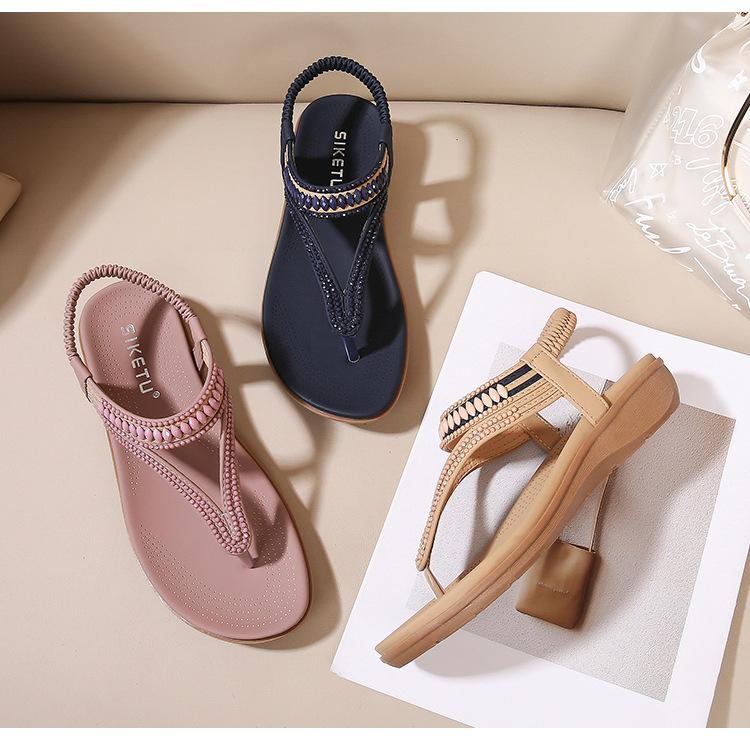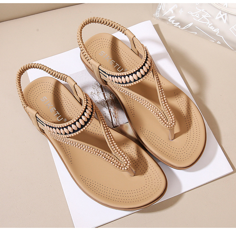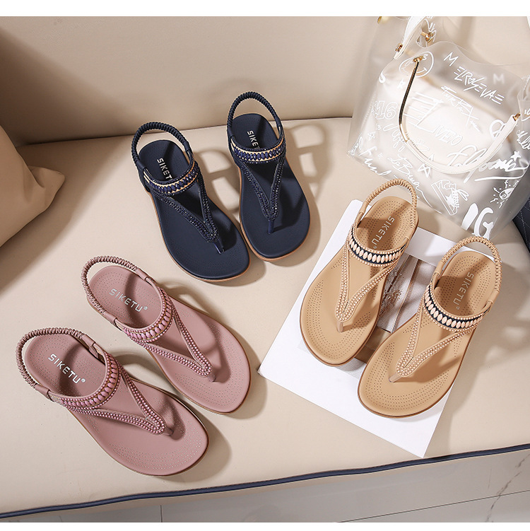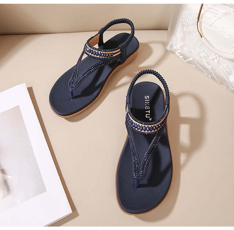 2025 летние новые европейские и американские женские сандалии с эластичными ремешками, бисером, мягкие, дышащие, легкие и удобные, женские туфли на танкетке большого размера.