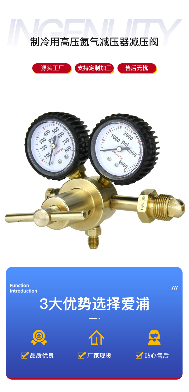 Полная медь внешней торговли высокого давления азота редуктор американского CGA580 высокого давления азота редуктор с 1,5 м кожаной трубкой