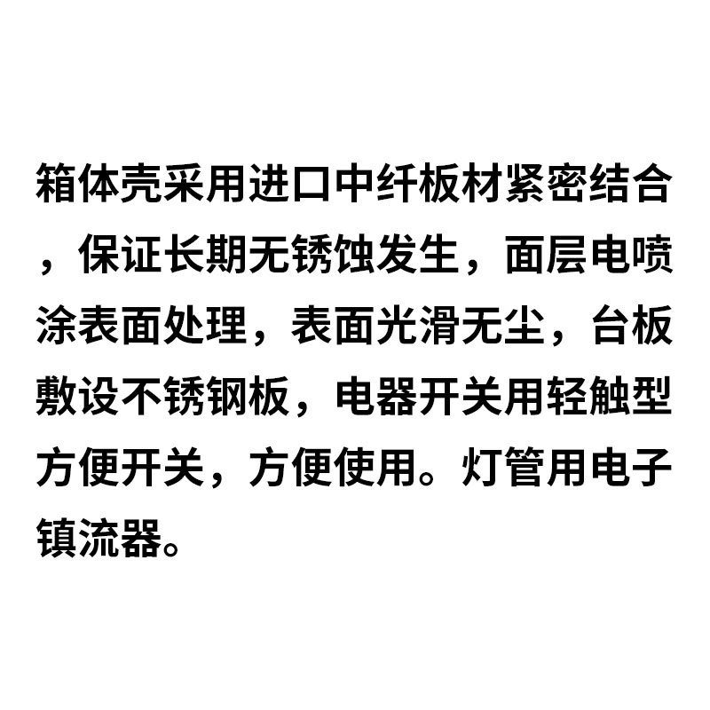 箱体壳采用进口中纤板材紧密结合,保证长期无锈蚀发生,面层电喷涂表面处理,表面光滑无尘,台板敷设不锈钢板,电器开关用轻触型方便开关,方便使用。灯管用电子镇流器。