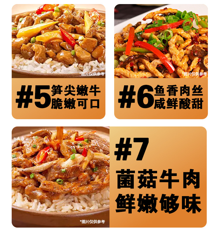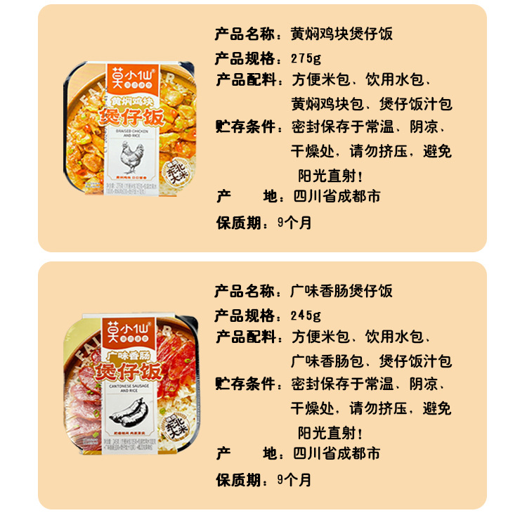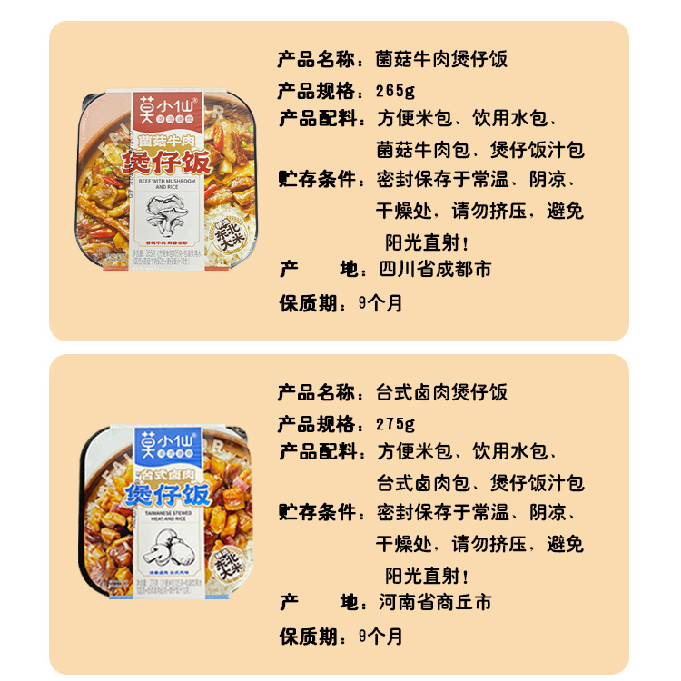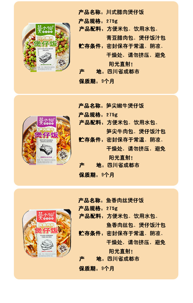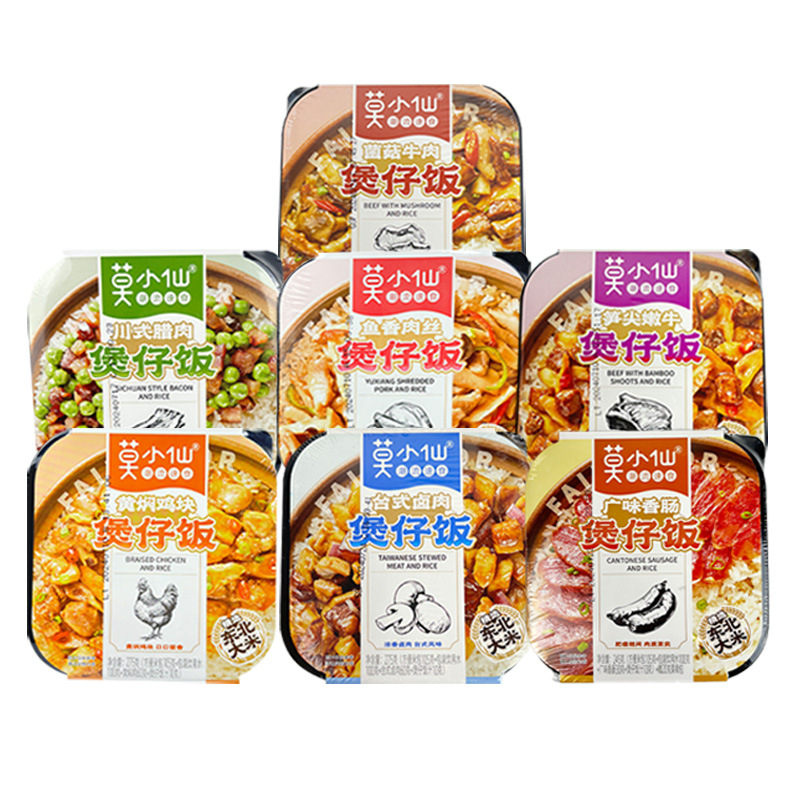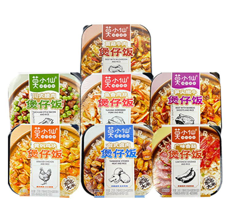 265 г/коробка грибного говядины; 275 г/коробка Тайваньская тушеная свинина; 245 г/коробка кантонской колбасы; 275 г/коробка измельченной свинины со вкусом рыбы; 340 г/коробка Maoxuewang маленькая кастрюля; 260 г/коробка маленькая кастрюля Malatang; 300 г/коробка старая маленькая кастрюля Чэнду; 275 г/коробка тушеных куриных наггетсов; 275 г/коробка нежной говядины с кончиками бамбуковых побегов; 275 г/коробка бекона в прованском стиле; 305г/кор. Тушеная свинина с маринованными овощами; 285 г/коробка говядины карри