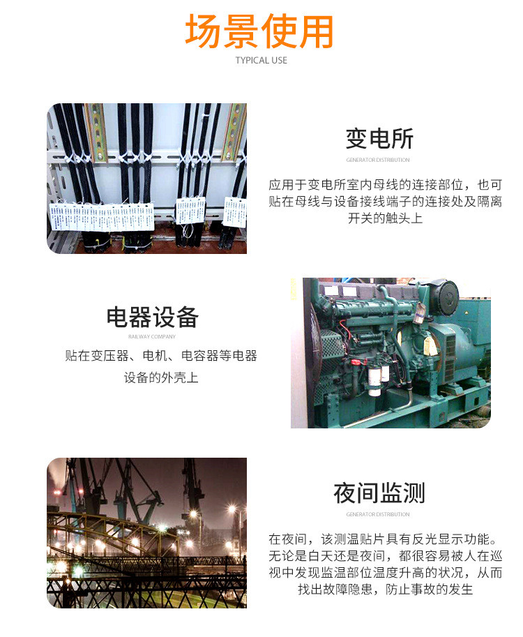 不可逆型变色测温贴片具有独特的变色示温、醒目显示及温度记录功能,自身带有压敏胶,应用于变电所母线的连接部位,也可贴在母线与设备接线端子的连接处及隔离开关的触头上,还可贴在变压器、电容器、电机等电气设备的外壳上,用来监视母线连接处及电气设备外壳的温度。一旦监测部位的温度达到或超过测温贴片的额定温度,变色测温贴片便快速变色。该测温贴片超温后颜色由白变黑,颜色变化醒目。无论是白天还是夜间,都很容易被人在巡视中发现监测部位温度升高的状况,从而找出故障隐患,防止事故的发生。如果监测部位因温度过高造成测温贴片超温变色,冷却下来后测温贴片并不恢复原来的白色,呈现记录状态。