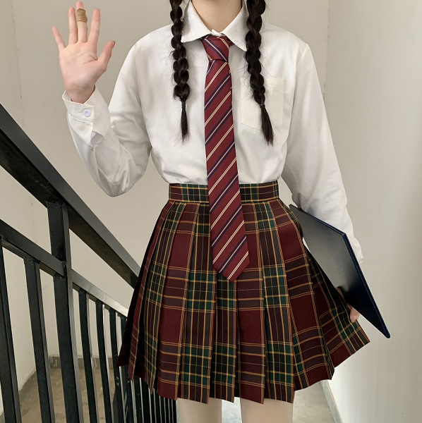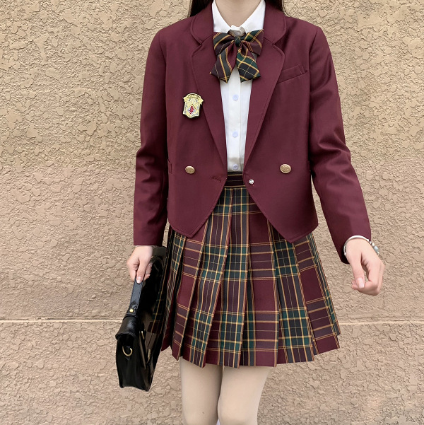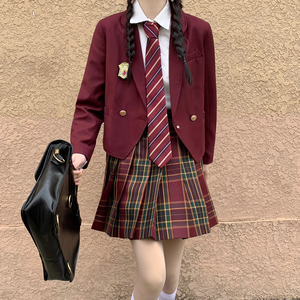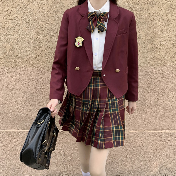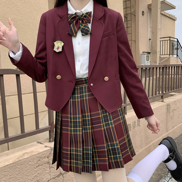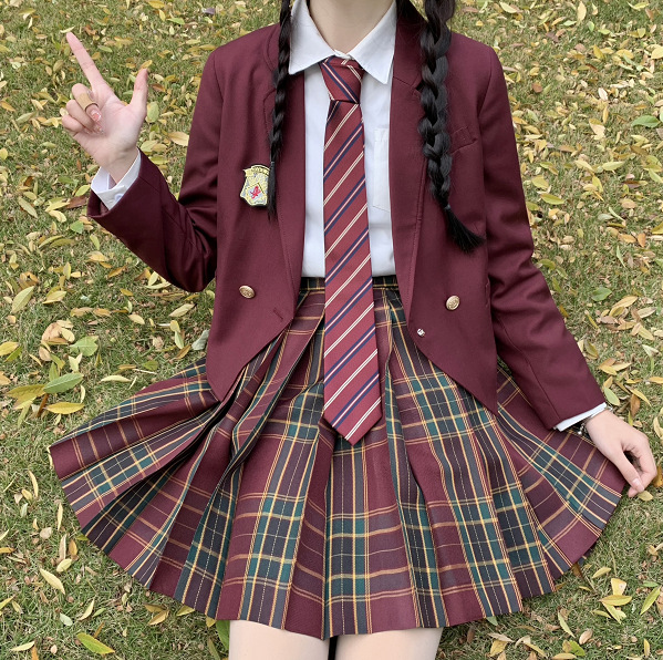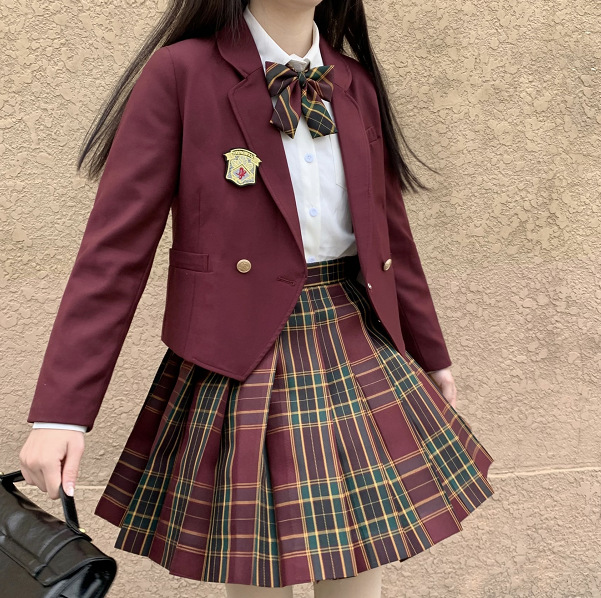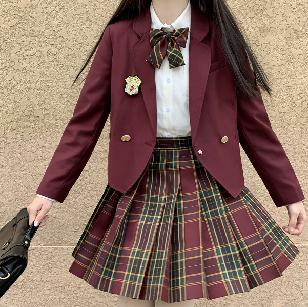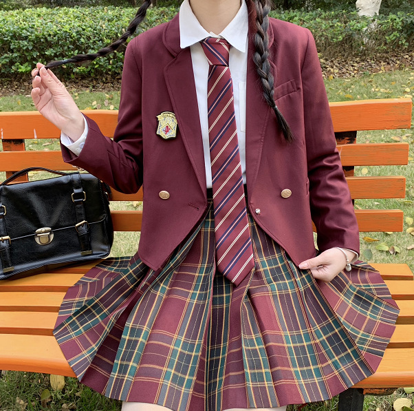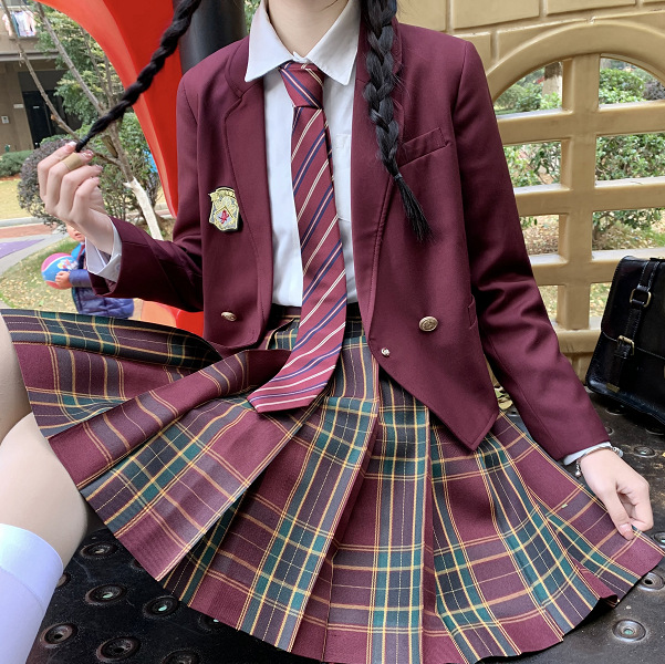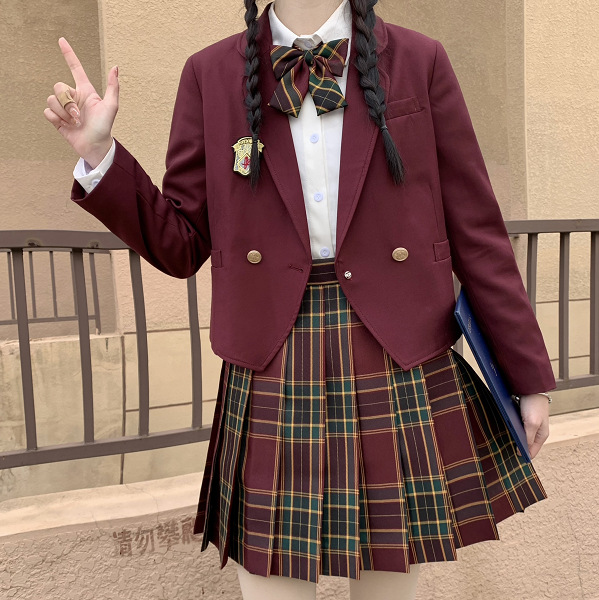 Клетчатая юбка боярышника + галстук-бабочка; Длинная блузка рукава; Клетчатая юбка из боярышника + галстук-бабочка + блузка с длинным рукавом; Плетеная юбка из боярышника + галстук-бабочка + блузка с длинным рукавом + короткий костюм винно-Красного цвета + значок Dong Yan; Винный красный короткий костюм