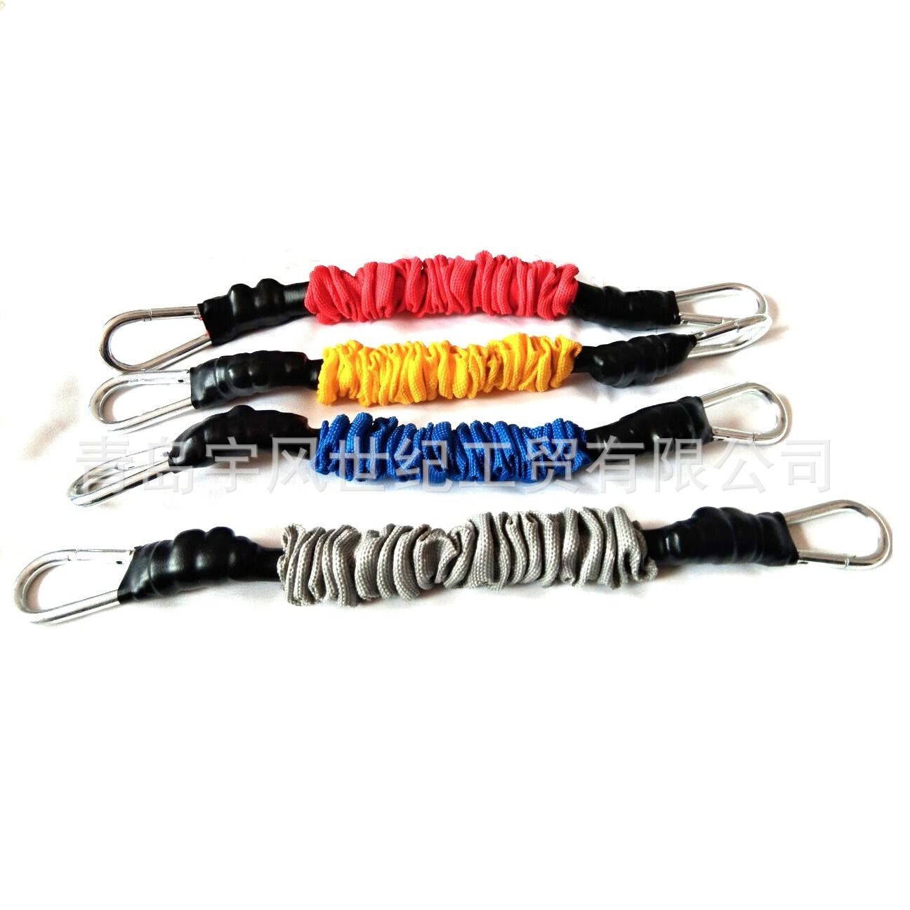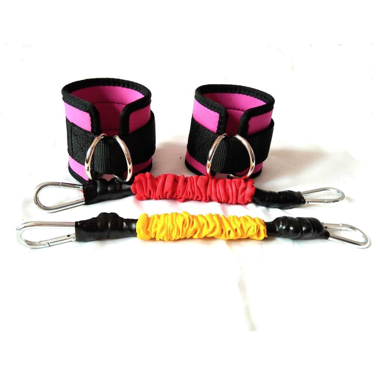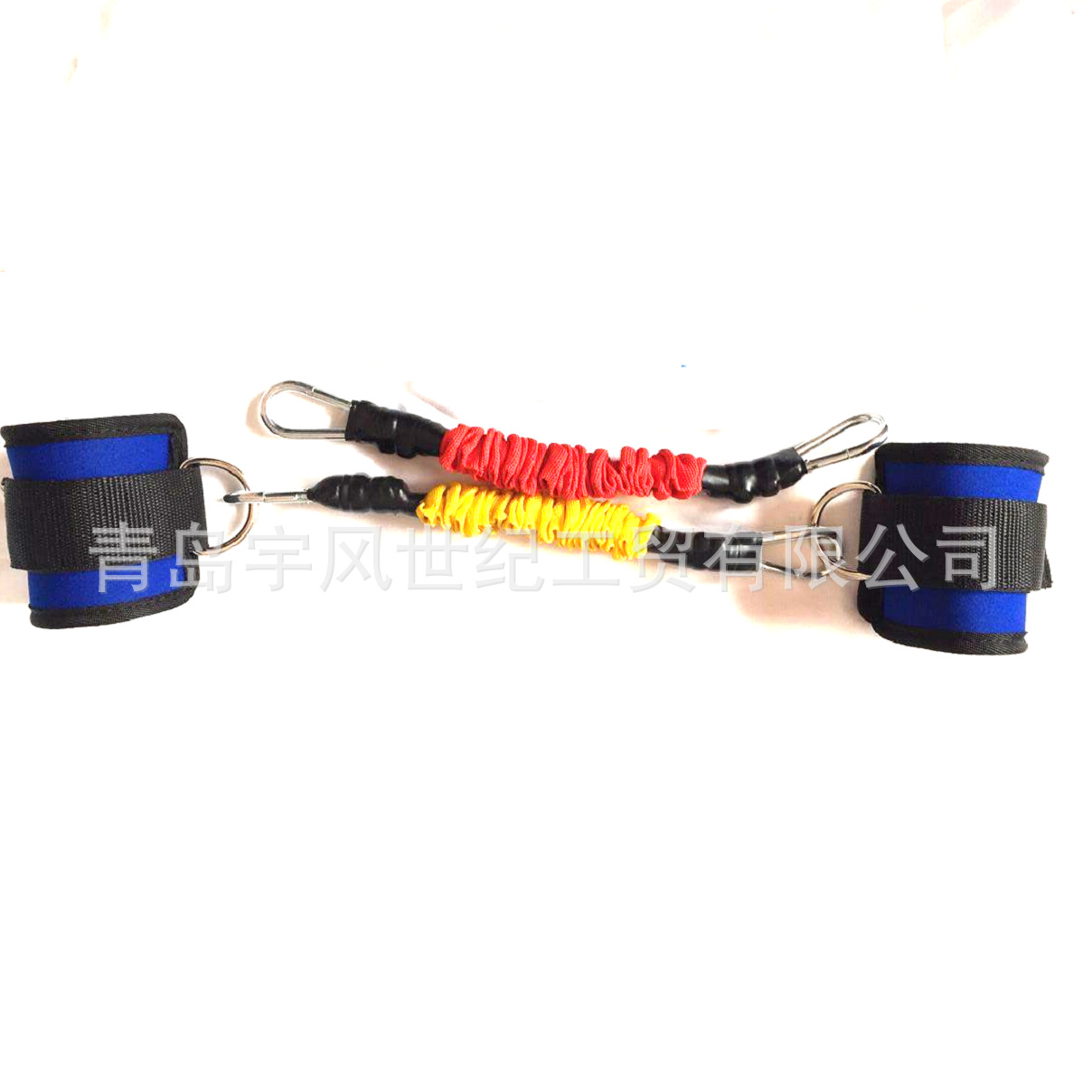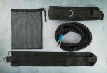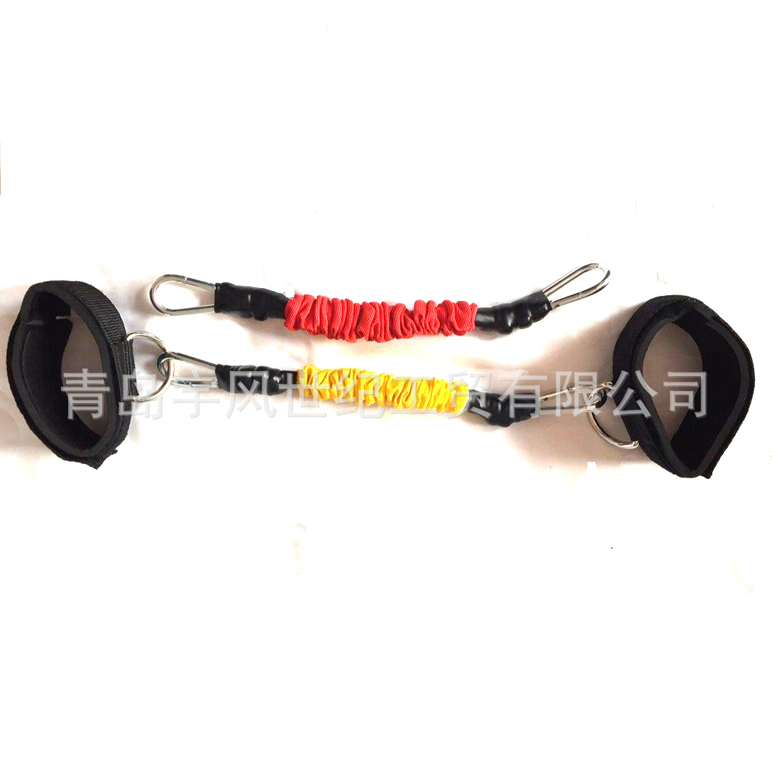 产品配套两个脚踝扣和两套套织带乳胶胶管弹力绳,长度60cm,限定拉伸长度1.9米。