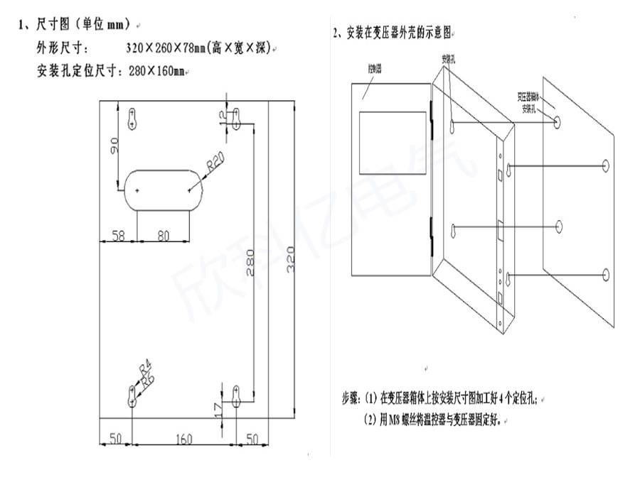 11.设备外型尺寸: 320*260*78mm,安装孔尺寸:280*160mm,挂壁式安装