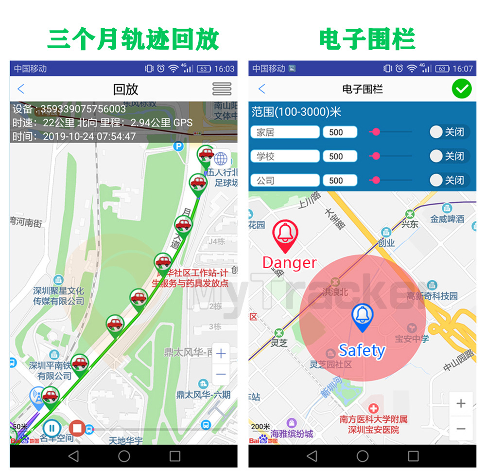 2、历史轨迹查询:随时随地查询设备三个月内运行轨迹;