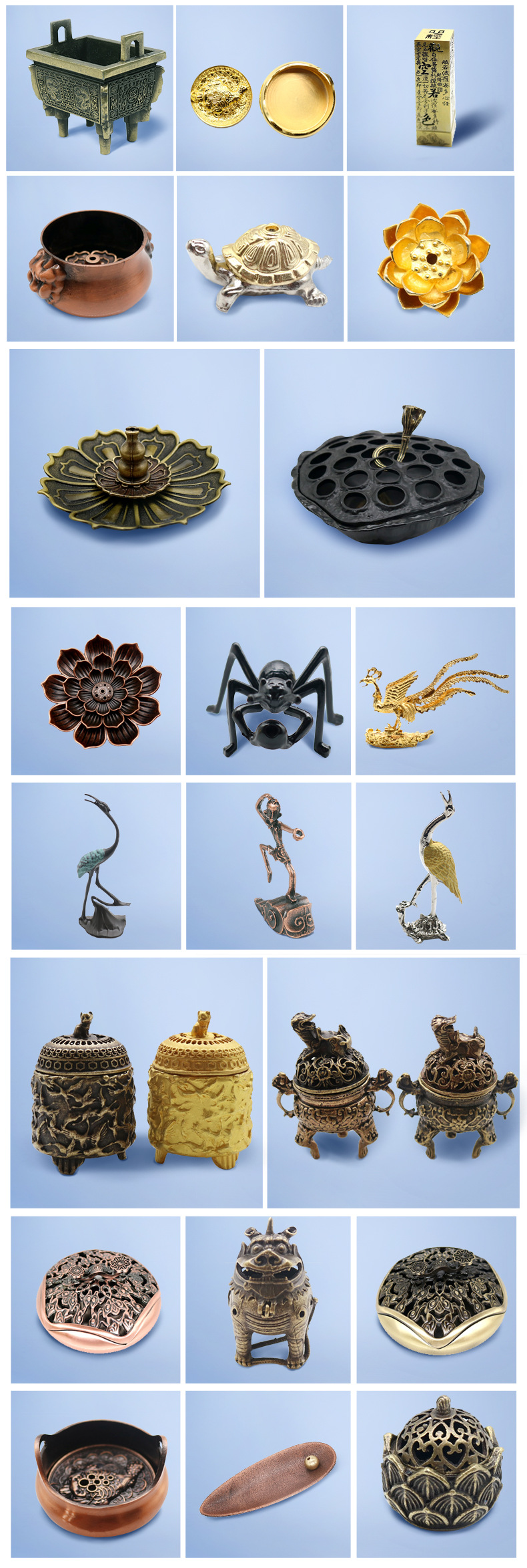 Благовония золотого журавля; Древняя бронзовая курильница с журавлем; Серебряный маленький Лотос; Маленький Золотой Лотос; Золотой Феникс; Кран протектор черепаха; Браун Крейн; Муравей