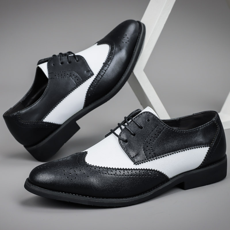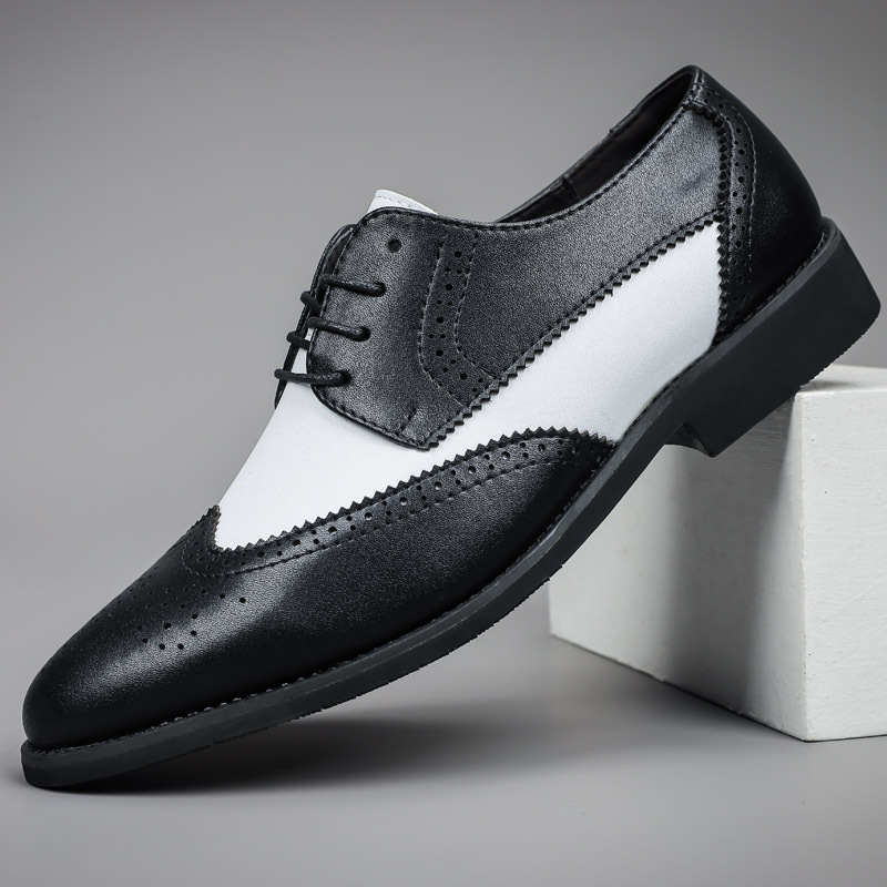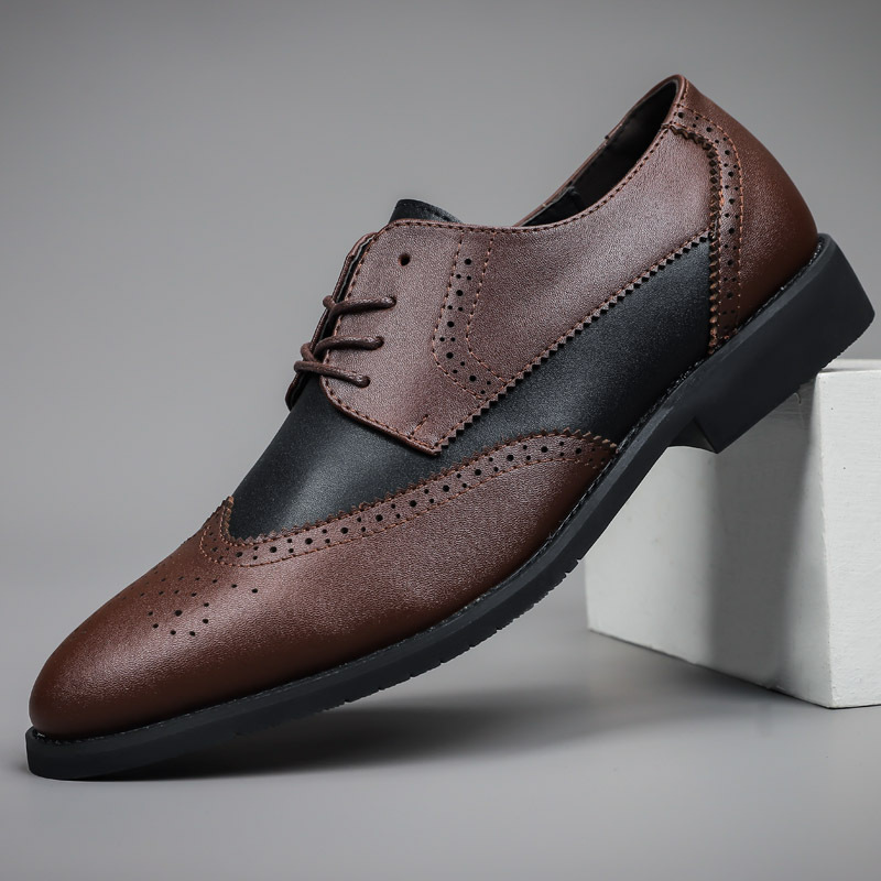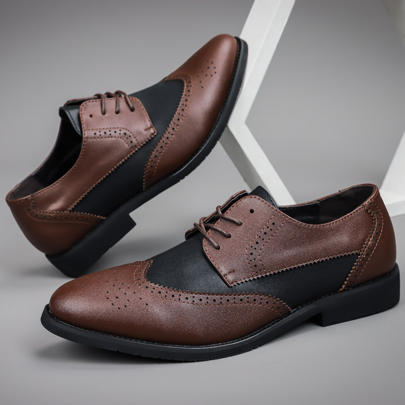 Мужская обувь, броги, деловая кожаная обувь, официальная повседневная обувь, подходящая по цвету, контрастная Весенняя низкая кожаная поверхность с резной отделкой, большие размеры, трансграничная