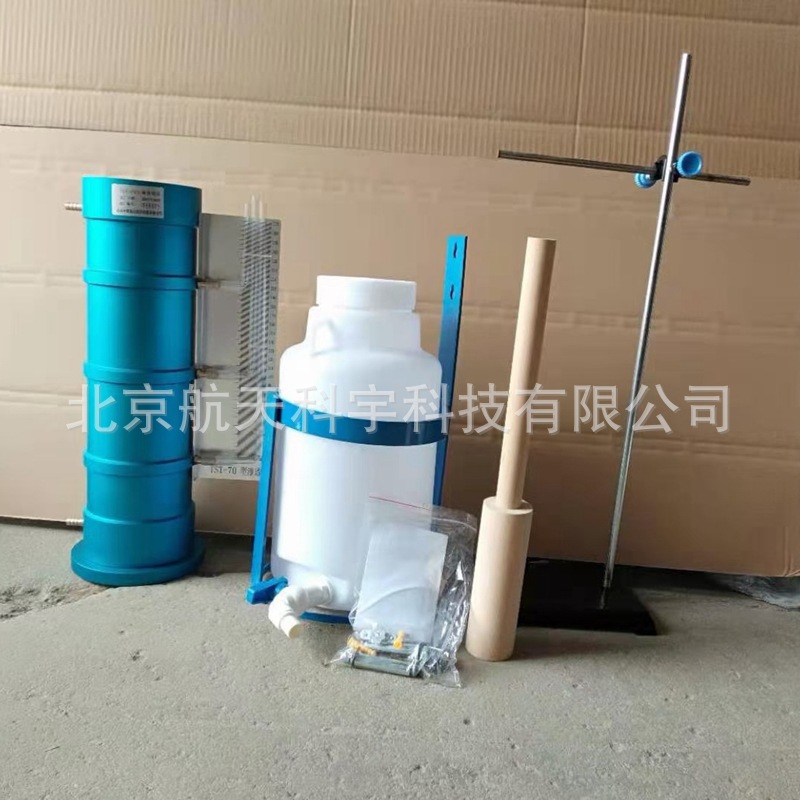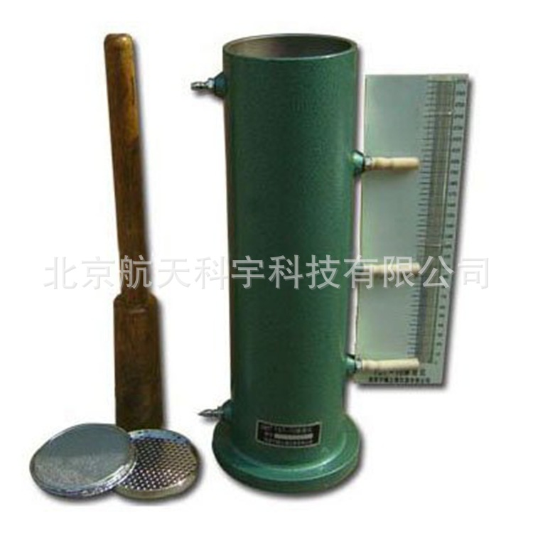 本仪器主要由渗水部件和击实部分组成。渗水部件由筒身、渗水板、刻度板、测压管等组成,在刻度板上装有三个测压管,其间距为100±0.44mm,水位的测读可由安装在筒上的刻度板的刻度读出,测压管接头内均装有铜丝布以防止细砂粒在试验时随水流出。渗水筒下部有一排水孔,松开螺栓即可放出污水。击实部分备有木锤,以击实试样。