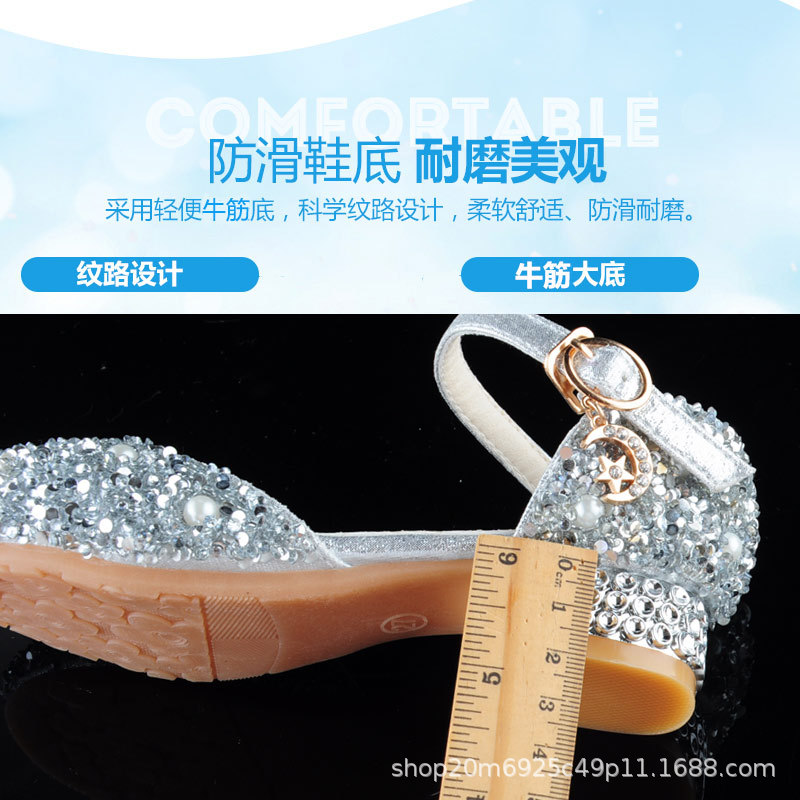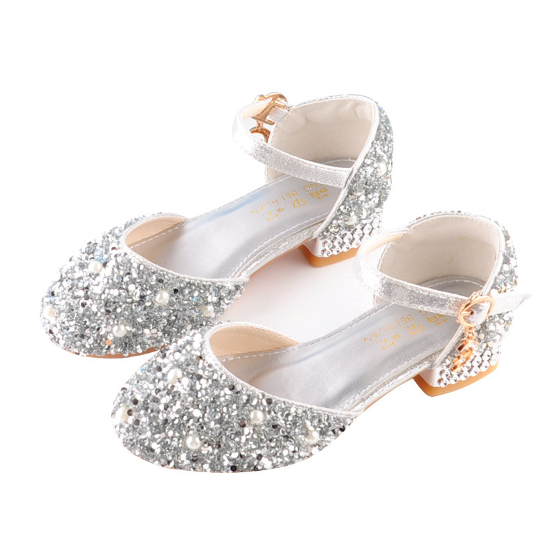 Детские кожаные туфли для девочек на высоком каблуке, серебристые с платьем, Большие Детские одиночные туфли, туфли для учеников начальной школы, хрустальные туфли, модель принцессы, подиум