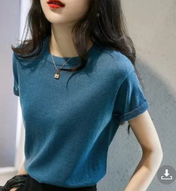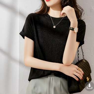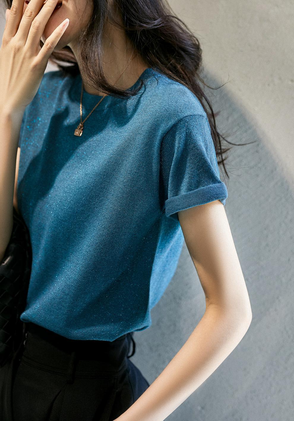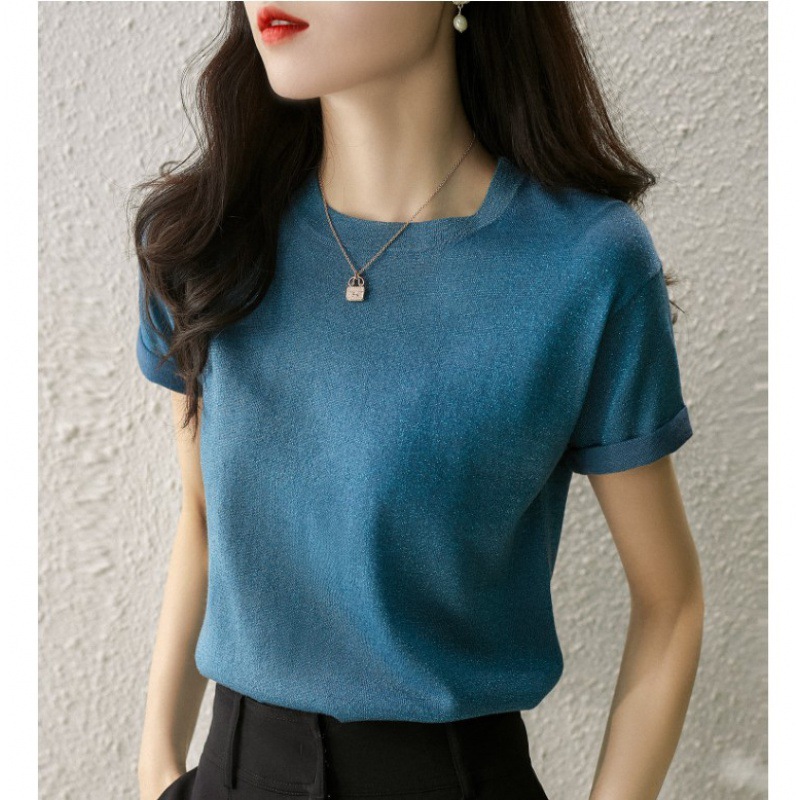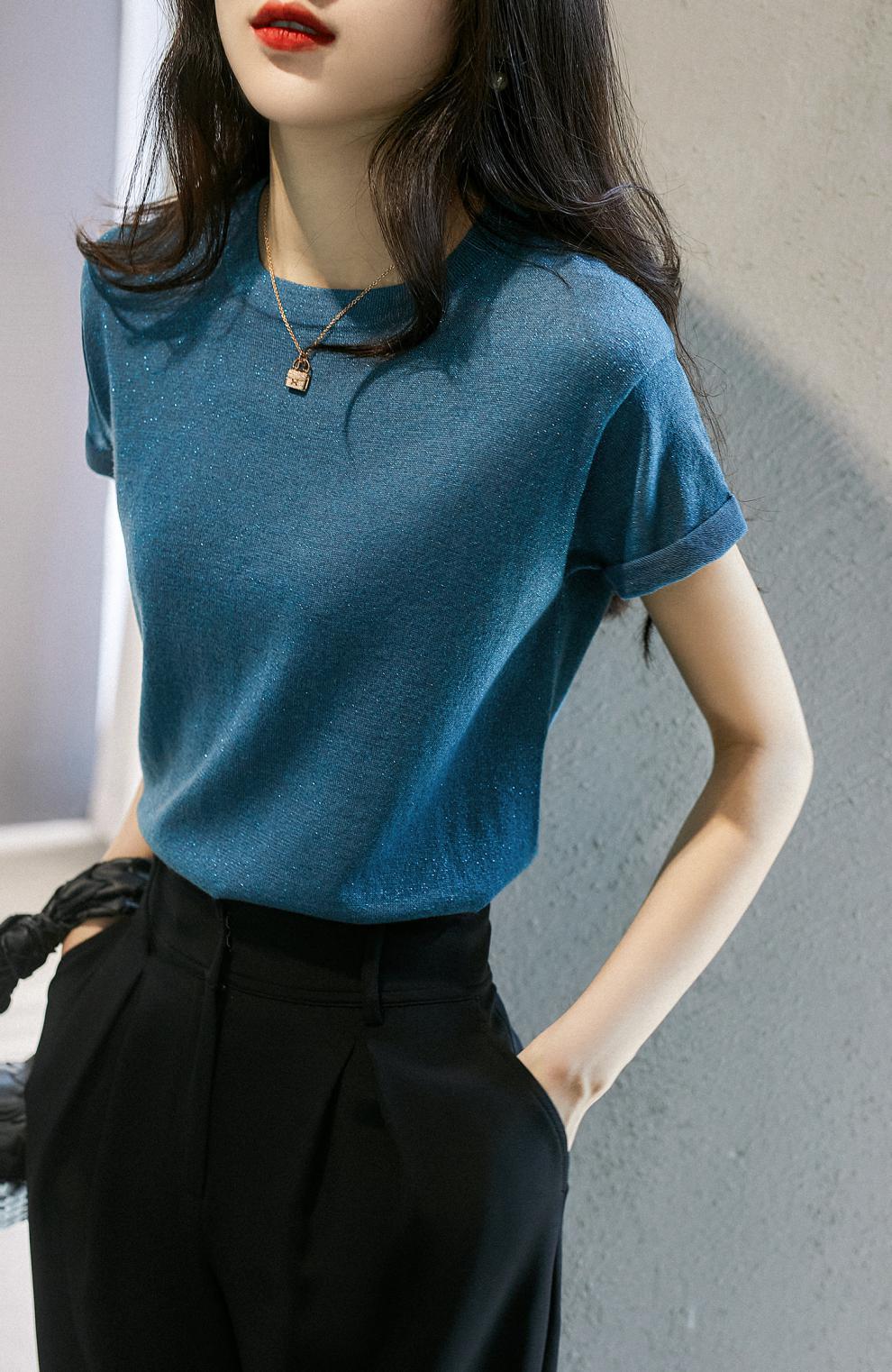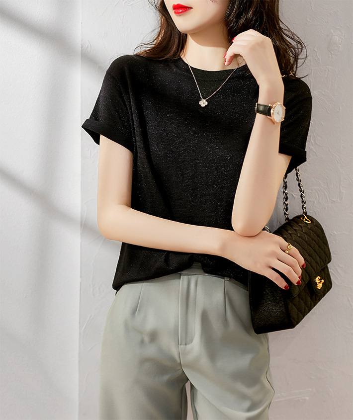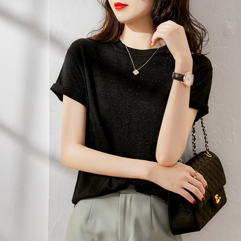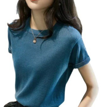 Женская блузка с круглым вырезом из блестящего шелка, летняя тонкая модная свободная футболка 2025, облегающая, из ледяного шелка, трикотажная