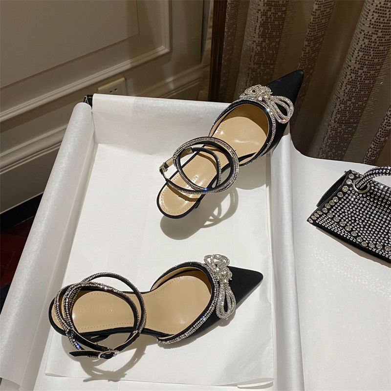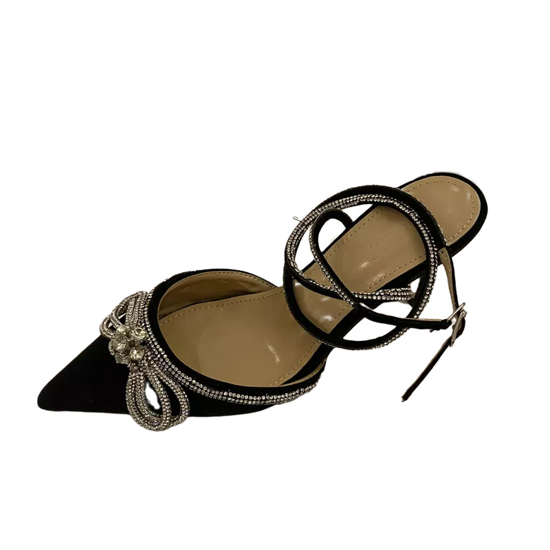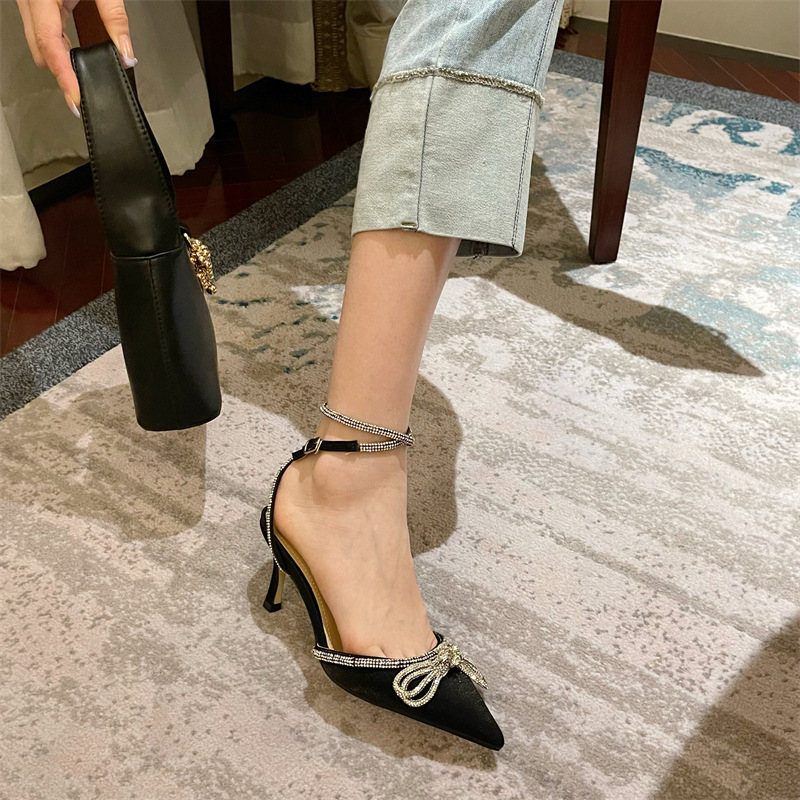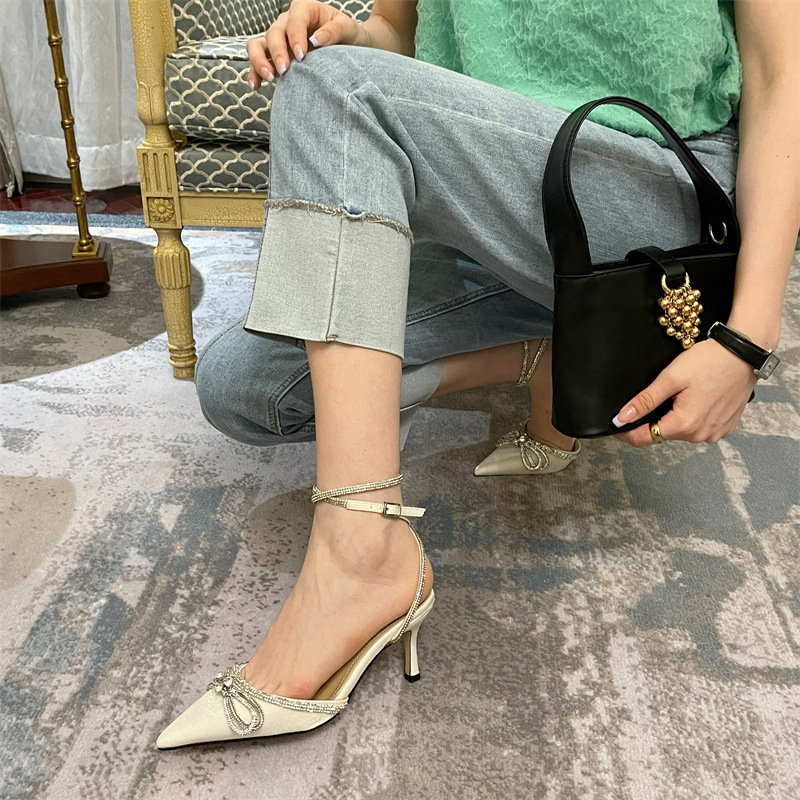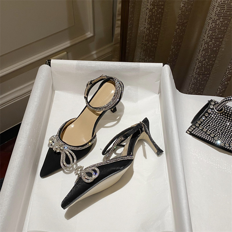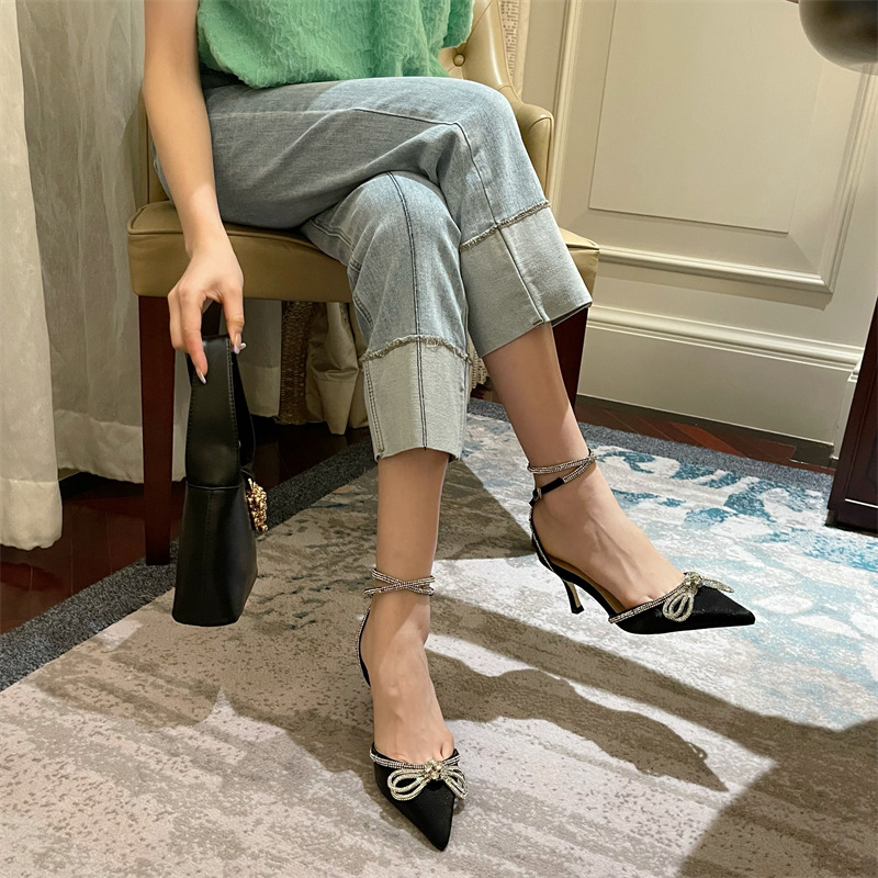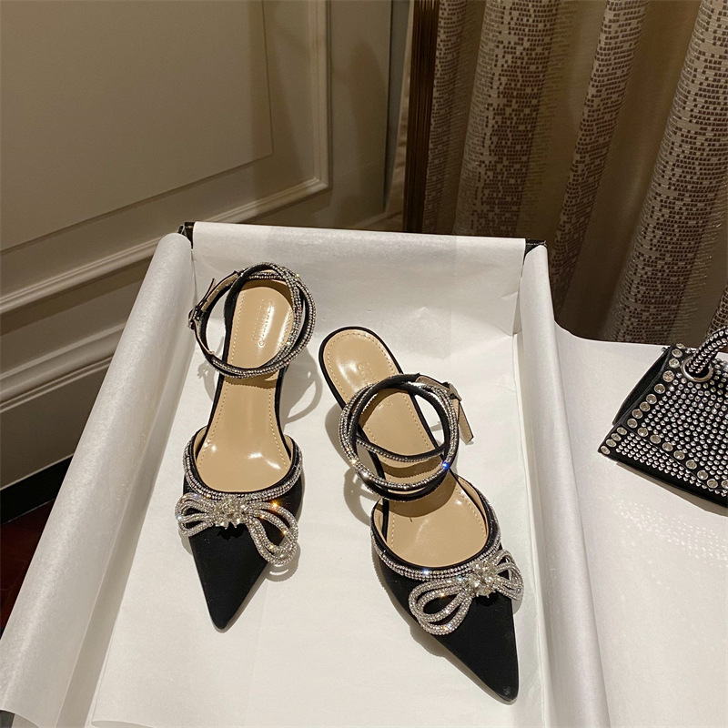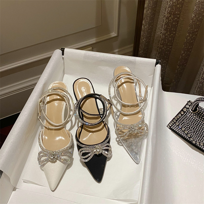 2024 летние новые модные сандалии на тонком каблуке со стразами и бантом для внешней торговли, Интернет-знаменитостей, пустые женские туфли с завязками на спине