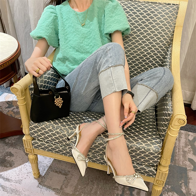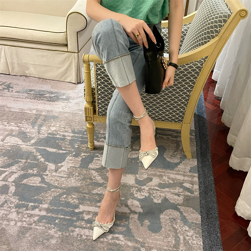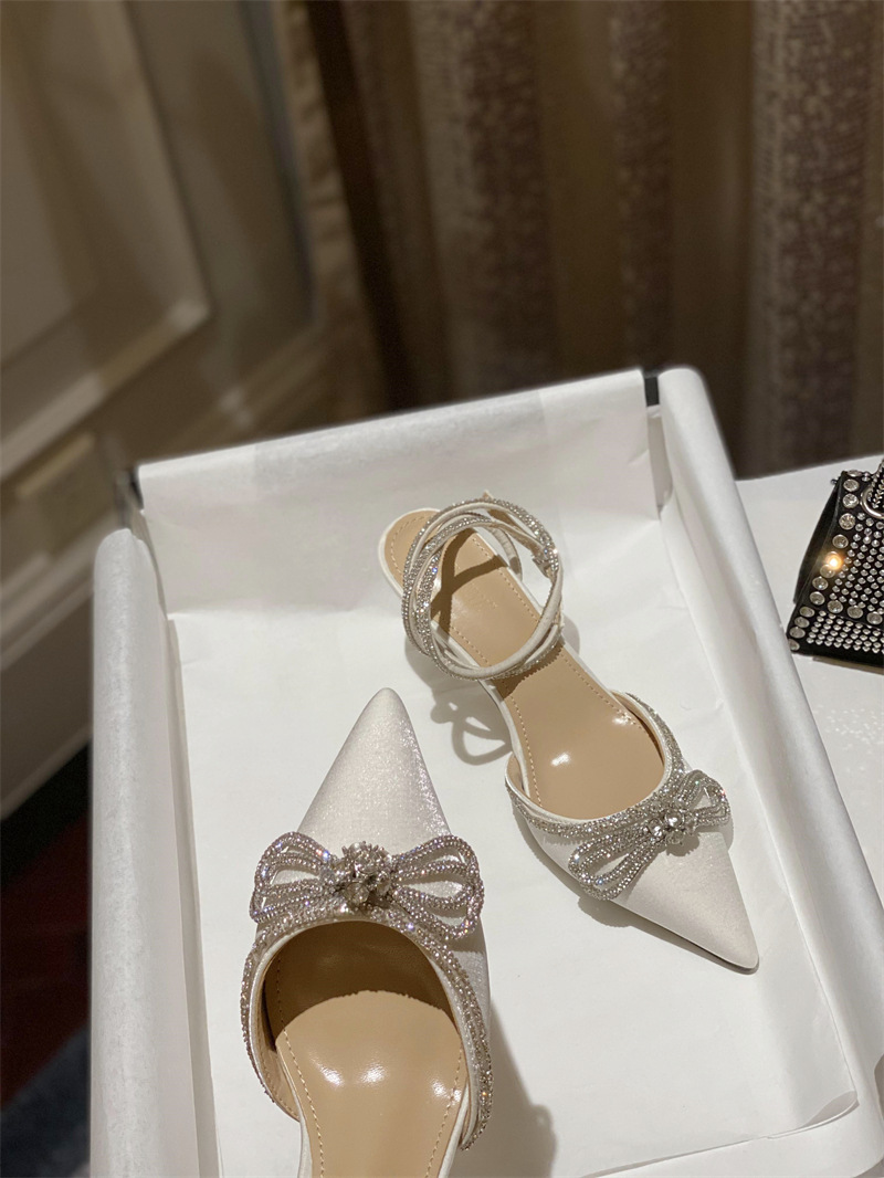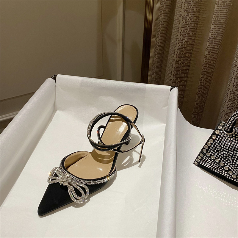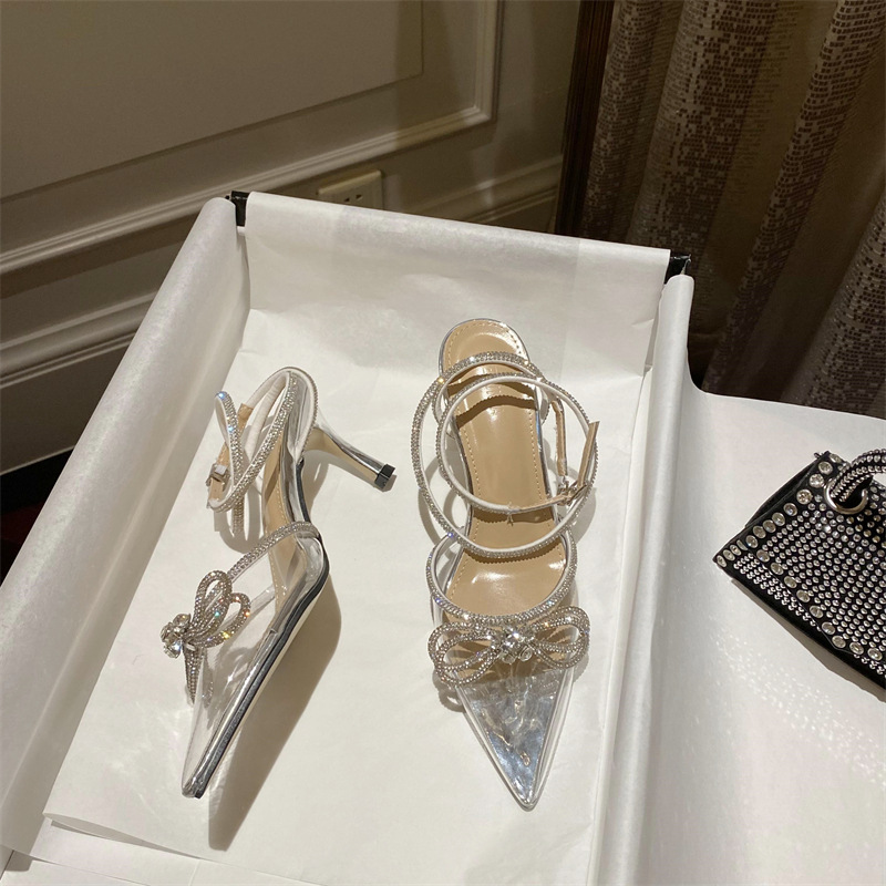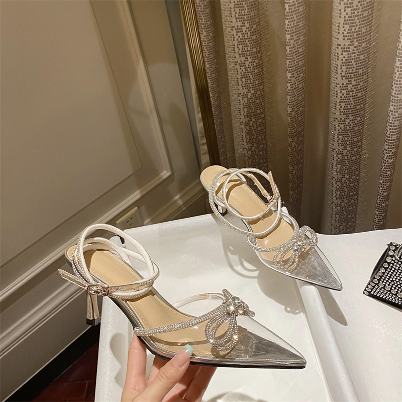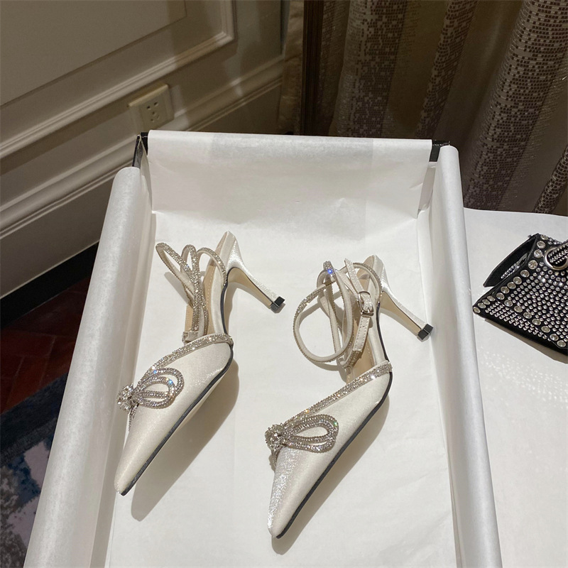 2024 летние новые модные сандалии на тонком каблуке со стразами и бантом для внешней торговли, Интернет-знаменитостей, пустые женские туфли с завязками на спине