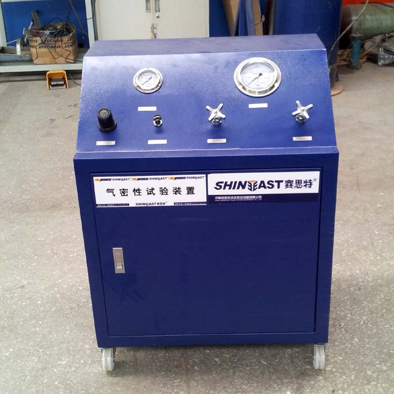 该装置是采用我公司生产的增压比为 40:1的气体增压泵,其动力来源是空压机的0.3-0.8MPa的压缩空气,额定输出压力为12-32MPa。装置上配有手动调压阀,通过调整增压泵的驱动压力即可无级调整增压泵的输出高压气体的压力,出口接有3米的高压测压软管,用户只需准备一排量在0.5-0.75m3/min的空压机,通上气管就可进行CNG汽车改装管路的气密性检测。